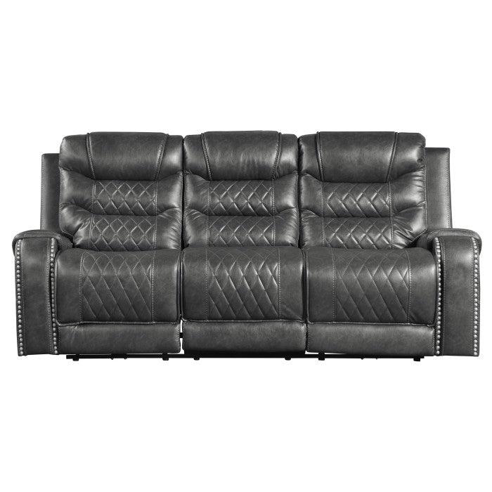 Sofá reclinable doble Putnam con portavasos abatibles, tomacorrientes y puertos USB en gris 9405Gy-3 | Homelegance