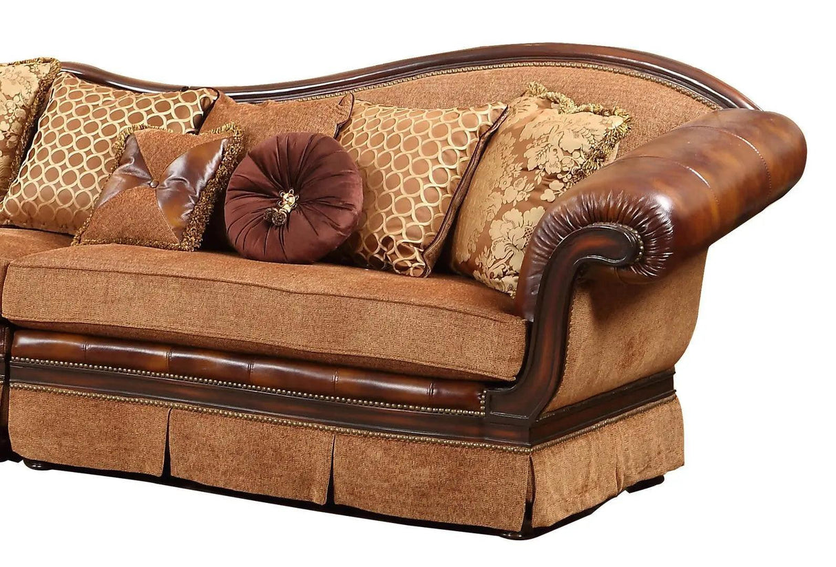 El sofá seccional Linda de estilo tradicional de Cosmos Furniture está disponible en tonos tostados y marrones con acabado en madera de cerezo. Este estilo tradicional se encuentra en su máxima expresión. Todo comienza con la madera oscura tallada, las lujosas telas y la gran variedad de cojines decorativos. El respaldo alto-bajo atrae la atención, lo que lleva la atención a la exquisita pieza esquinera con respaldo redondeado, en cuero genuino y capitoné.