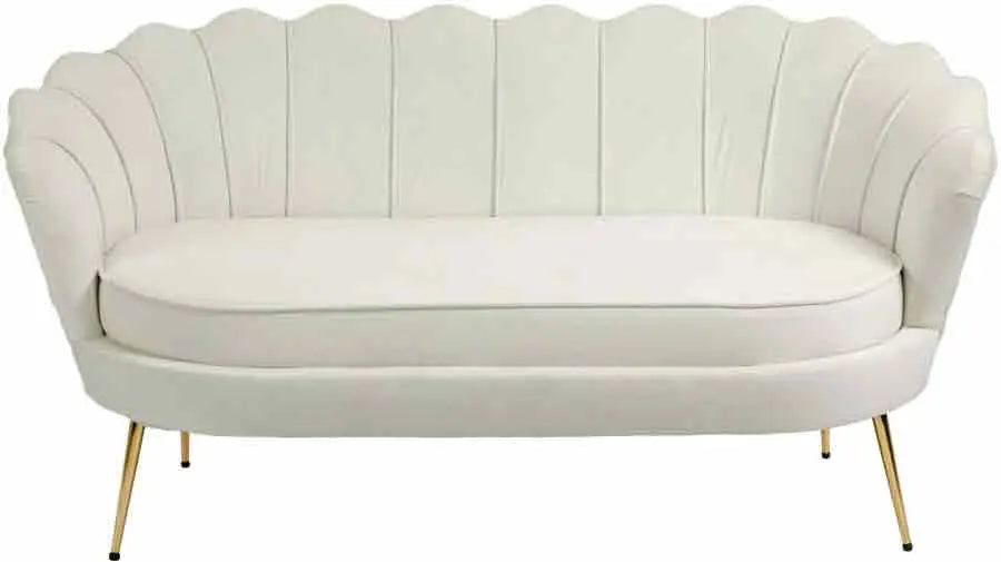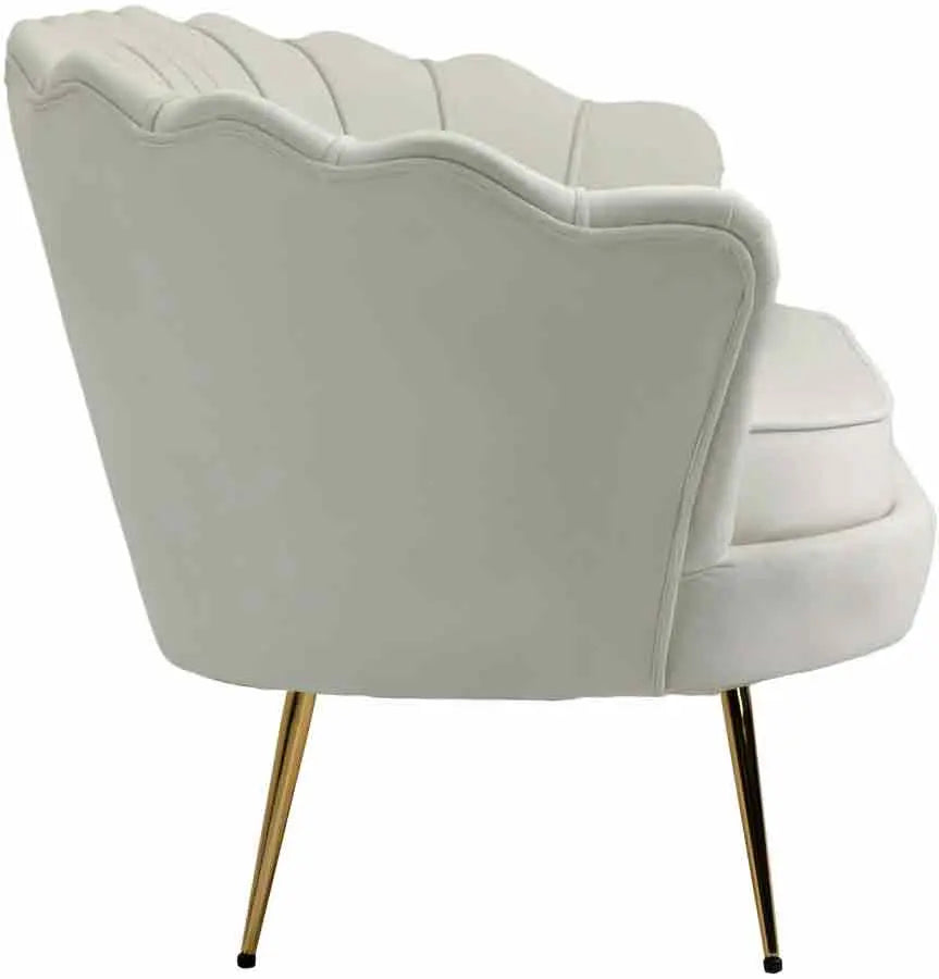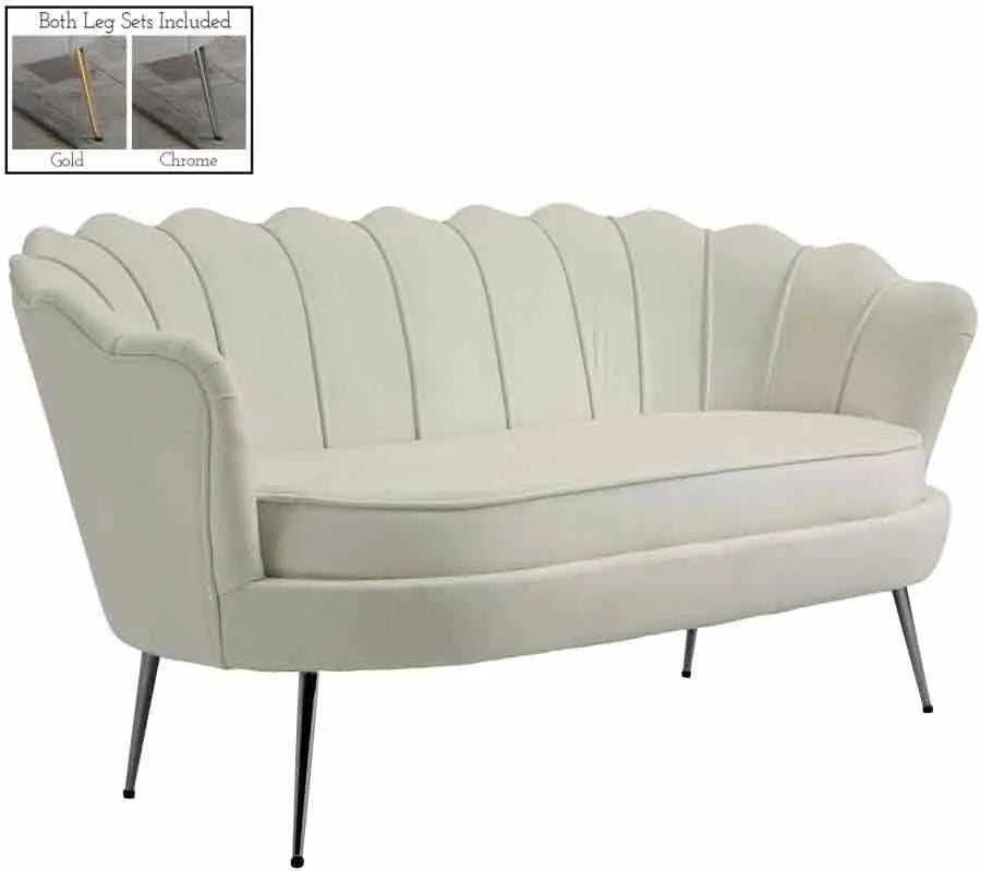 Llama la atención al instante al añadir este loveseat de terciopelo Gardenia a tu habitación. Este llamativo loveseat cuenta con un respaldo en forma de concha con un capitoné profundo con canales que le aporta una textura atractiva. El cojín redondo del asiento es profundo y amplio, lo que te da libertad de movimiento para ponerte cómodo. La tapicería de terciopelo color crema suave cubre todo el loveseat, excepto las patas, que están hechas de cromo para mayor durabilidad y con un acabado dorado que le da un toque de glamour.