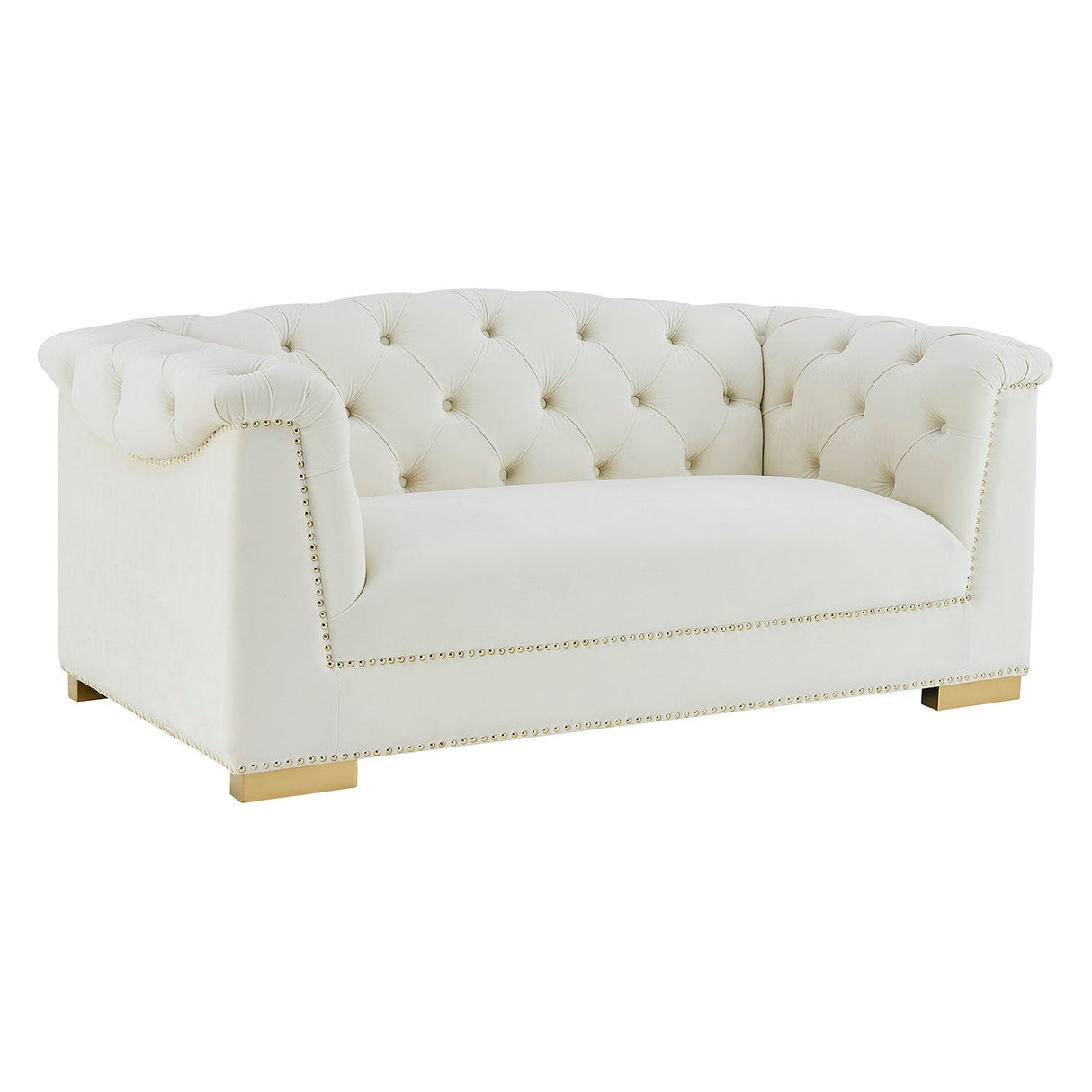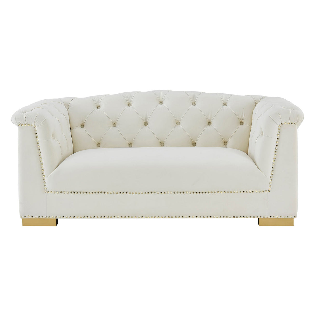 Ofreciendo un giro fresco y moderno a un estilo clásico, Inspire Me Home Decor y TOV presentan con orgullo el Loveseat Farah color crema. Con su suntuosa tapicería de terciopelo color crema, su exclusivo diseño capitoné en sus brazos enrollados y sus tachuelas doradas aplicadas a mano, será el centro de atención de su sala de estar. Disponible en varios colores neutros para adaptarse a las necesidades de su hogar.