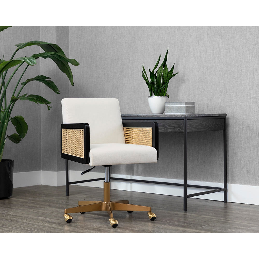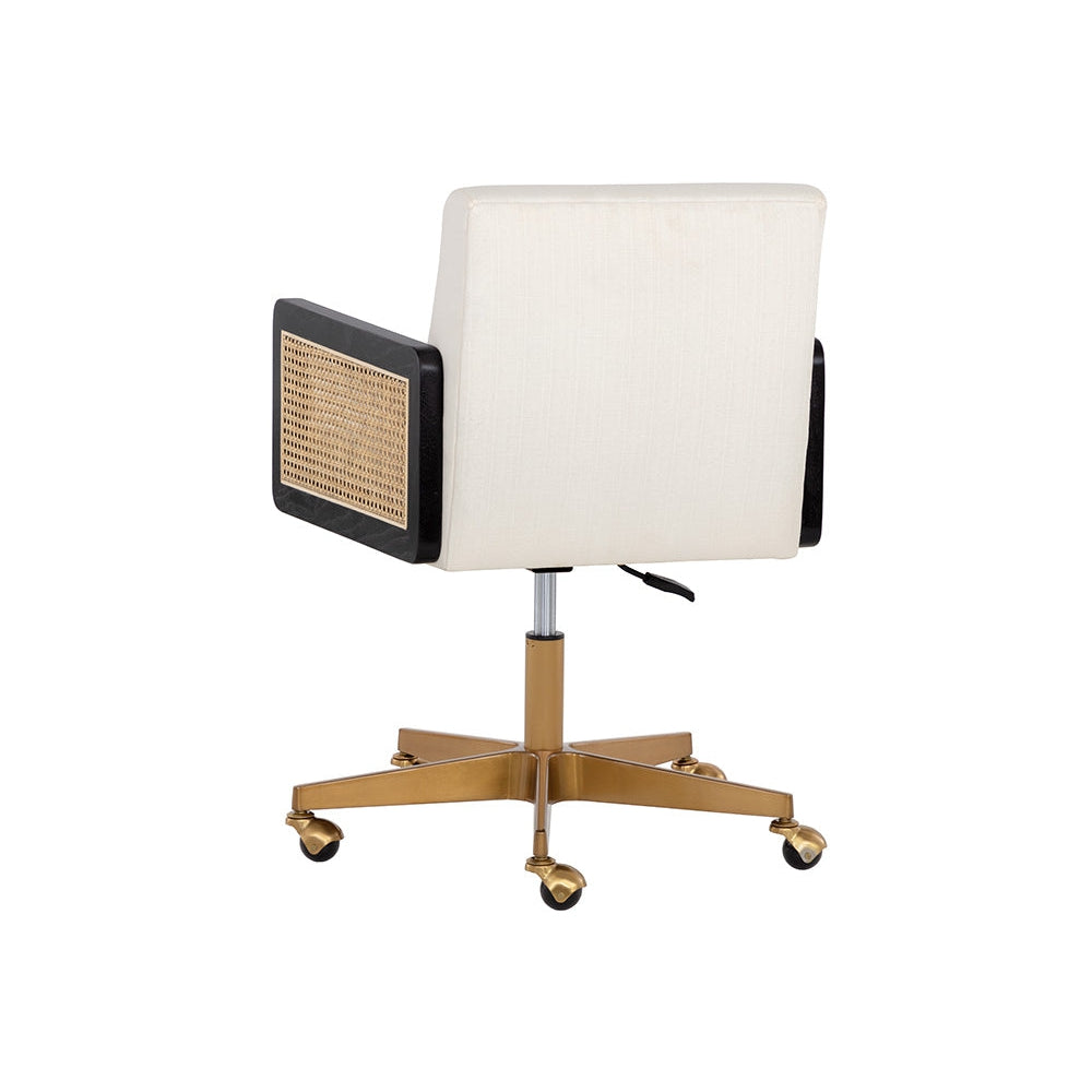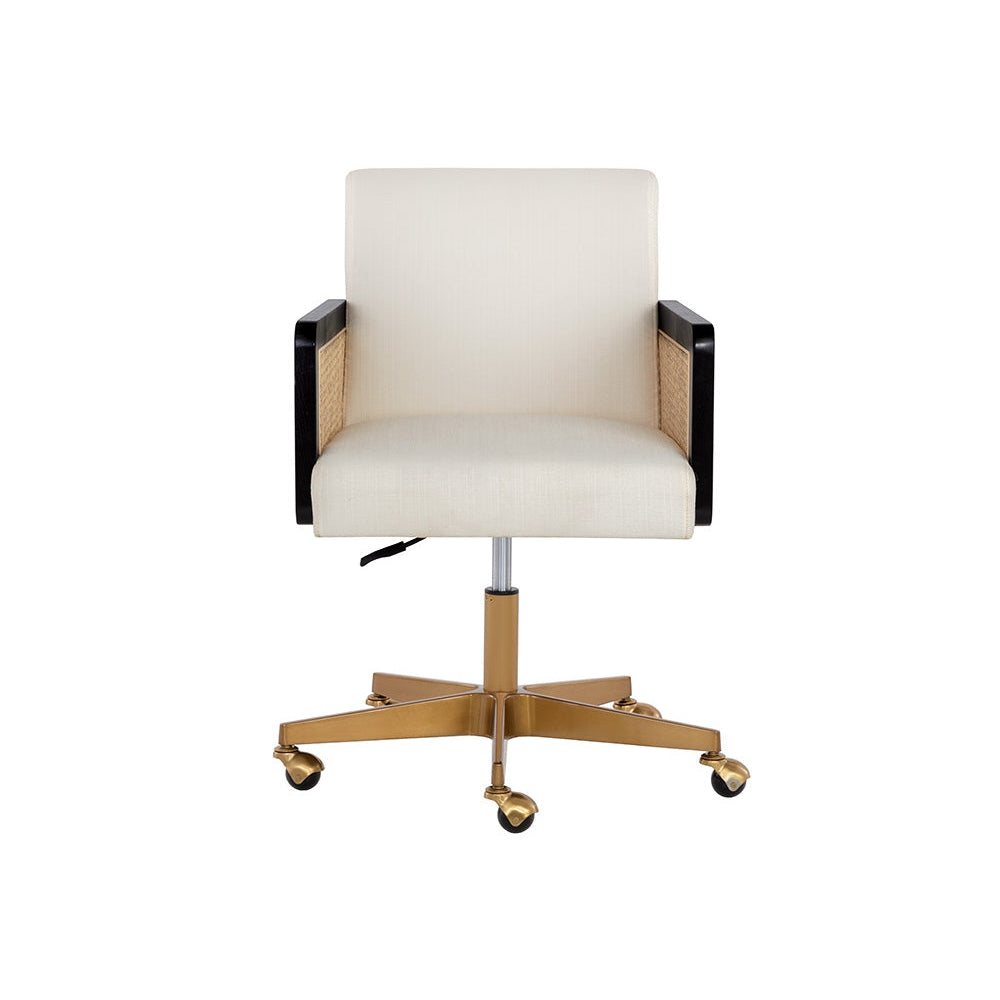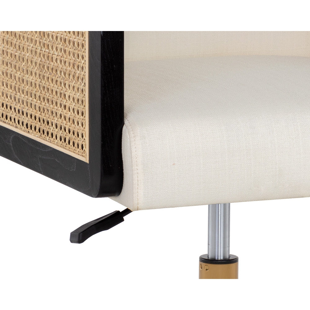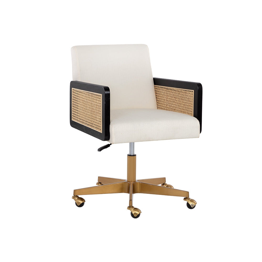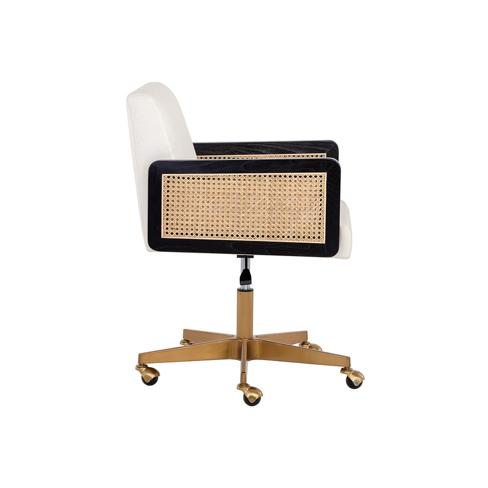 Combinando un estilo moderno con un toque de inspiración global, esta silla de oficina aportará textura a cualquier espacio de trabajo. Está confeccionada en tela linoso color marfil y cuenta con brazos de madera maciza de caucho negro con detalles de ratán natural. Se completa con una base de acero inoxidable dorado con ruedas. Cuidado: Este diseño está elaborado con ratán natural. Visite nuestra página de Cuidado del Producto para obtener más información sobre cómo garantizar la belleza duradera de esta pieza.