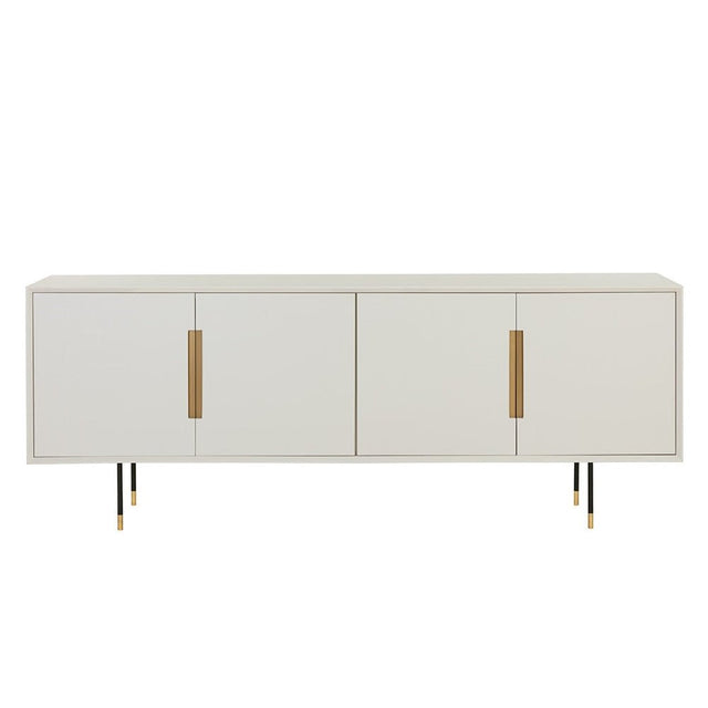 Pulido y elegante, este aparador presume de un diseño moderno y espectacular. Presenta una estructura de madera con un moderno acabado crema. Incluye cuatro cajones con tiradores y detalles rústicos de acero bronce. Se completa con patas de acero con recubrimiento en polvo negro y tapas de metal dorado. También puede usarse como consola multimedia y mueble. También dispone de cómoda y mesita de noche a juego.