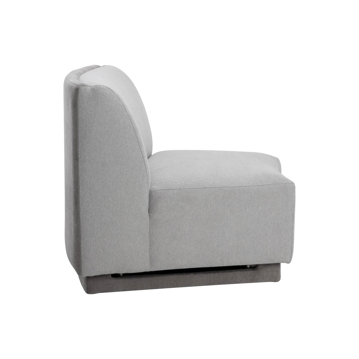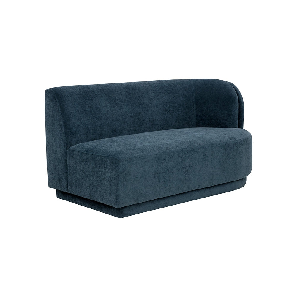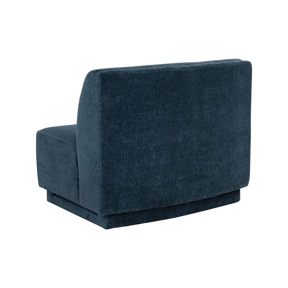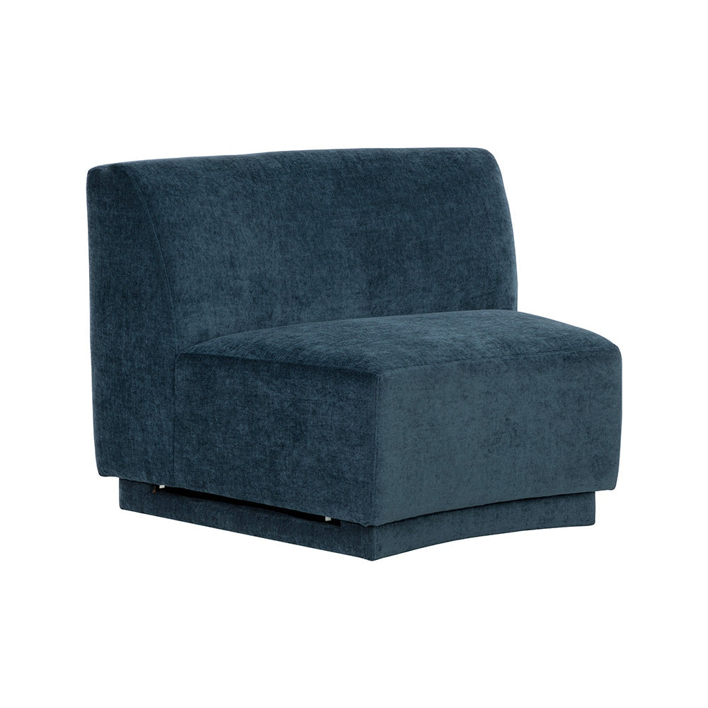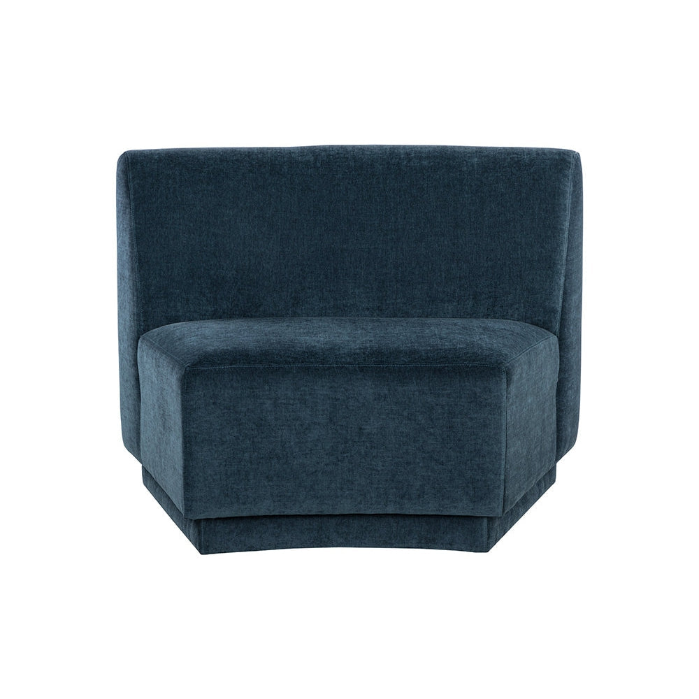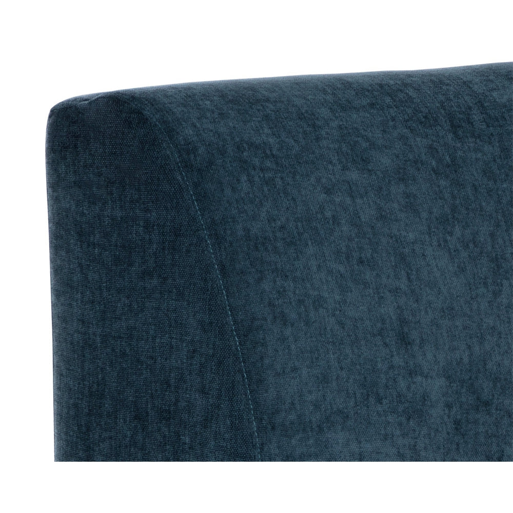Infunda comodidad en cualquier espacio con esta silla modular sin brazos, de líneas curvas y versatilidad en su colocación. Está confeccionada en tela azul polvoriento y cuenta con una estructura de madera de pino. Esta pieza se puede adquirir sola o en diversas combinaciones con los sillones Jaclyn izquierdo y derecho a juego.