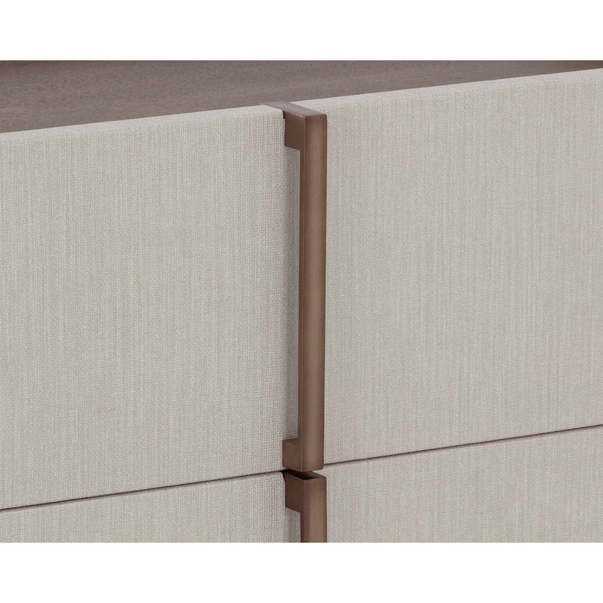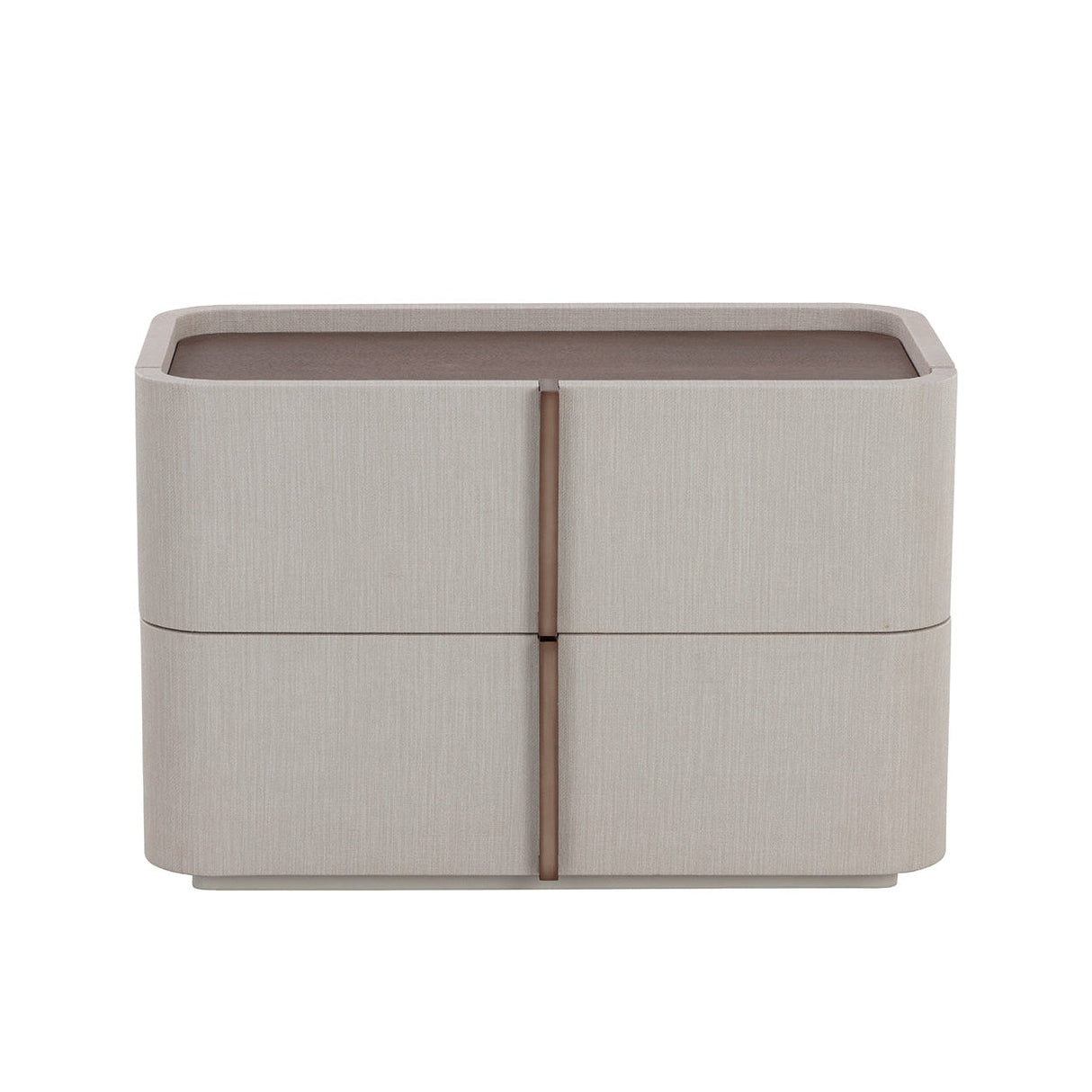 Esta mesita de noche grande y contemporánea se define por sus hermosas y suaves curvas. Tapizada en piel sintética color crema con un tablero de chapa de roble marrón que sin duda impresionará. Incluye dos cajones y se completa con una base de acero color bronce rústico. También disponible una cómoda a juego, junto con una versión de mesita de noche más pequeña. Cuidado: Este diseño está elaborado con piel sintética. La piel sintética se fabrica para reflejar las características naturales del cuero; por lo tanto, las variaciones de color, las marcas, arrugas, surcos y los ligeros arañazos son características apreciadas. No hay dos piezas iguales. Visite nuestra página de Cuidado del Producto para obtener más información sobre cómo garantizar la belleza duradera de esta pieza.