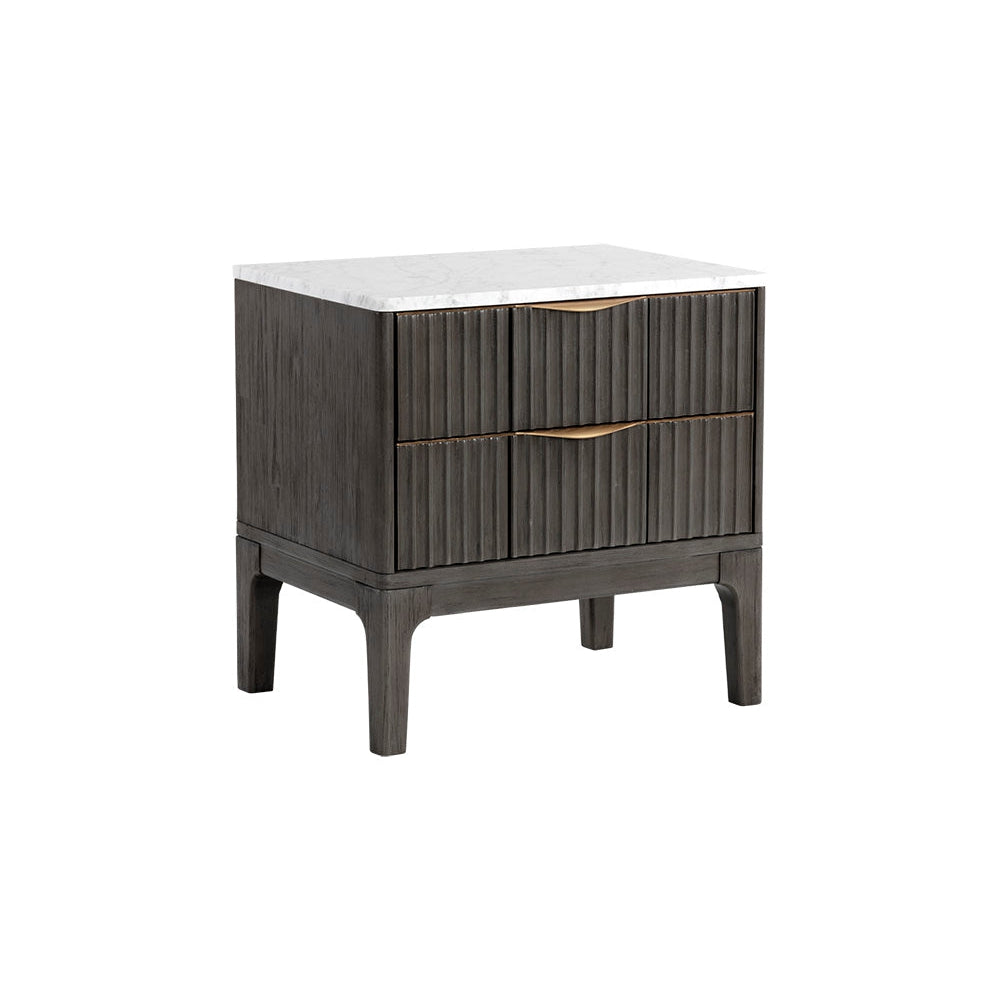Una mesita de noche esculpida de dos cajones con un elegante diseño moderno. Presenta una tapa de mármol blanco y una robusta base de madera de acacia con acabado gris cepillado. Incluye tiradores de metal cepillado. Incluye kit antivuelco. Combina a la perfección con la mesita de noche Keldon. Al ser el mármol un material natural, sus vetas, picaduras, fisuras, microgrietas y variaciones de color únicas son características que realzan la singularidad y belleza de cada pieza.