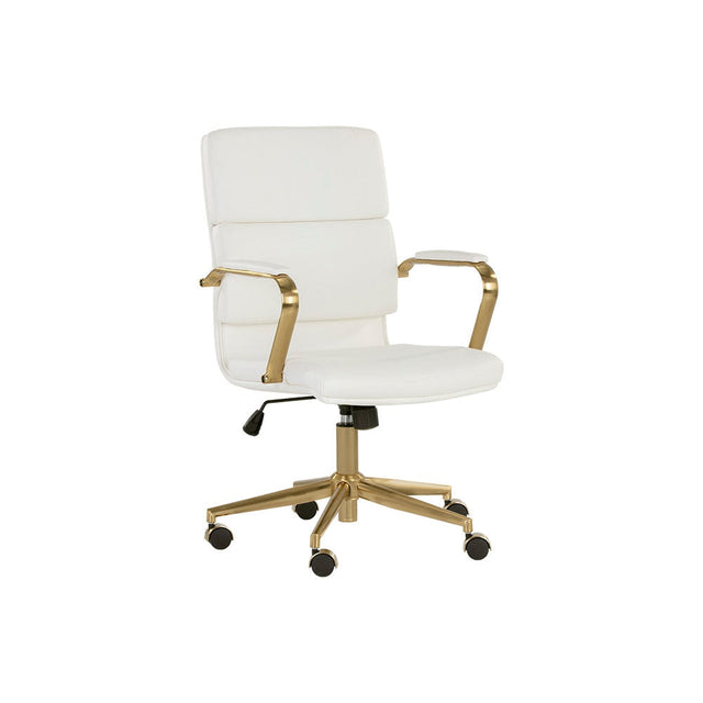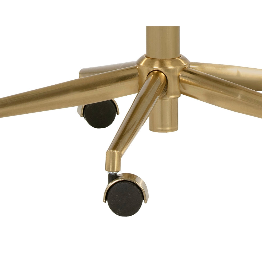 Cree un espacio de trabajo elegante y funcional con esta impresionante silla de oficina moderna. Disponible en piel sintética en tonos nieve, ónix y marrón, cuenta con un asiento generosamente acolchado para una comodidad óptima. Incluye ruedas para mayor movilidad y una estructura de acero inoxidable dorado. Cuidado: Este diseño está elaborado con piel sintética. La piel sintética se fabrica para reflejar las características naturales del cuero; por lo tanto, las variaciones de color, las marcas, arrugas, surcos y pequeños arañazos son características apreciadas. No hay dos piezas iguales. Visite nuestra página de Cuidado del Producto para obtener más información sobre cómo garantizar la belleza duradera de esta pieza.