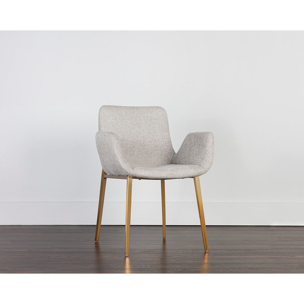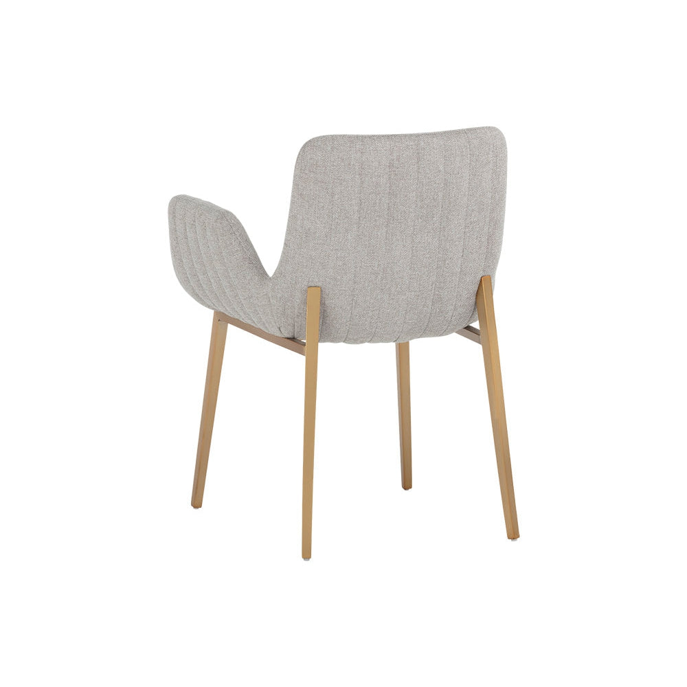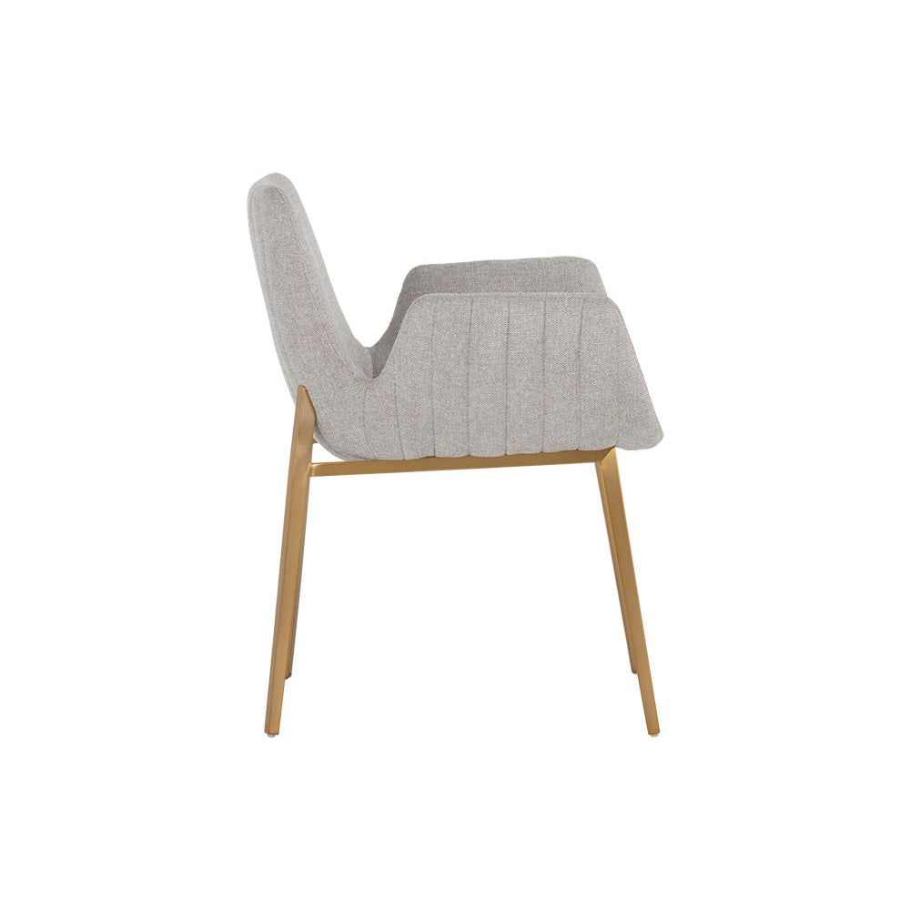 Con su impresionante diseño redondeado, este moderno sillón de comedor es una adición impactante a cualquier comedor. Presenta capitoné con canales verticales en el asiento exterior. Está disponible en telas color óxido Belfast, gris jaspeado y azul marino, y cuenta con patas de acero inoxidable dorado.
