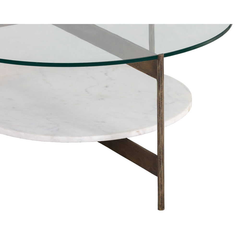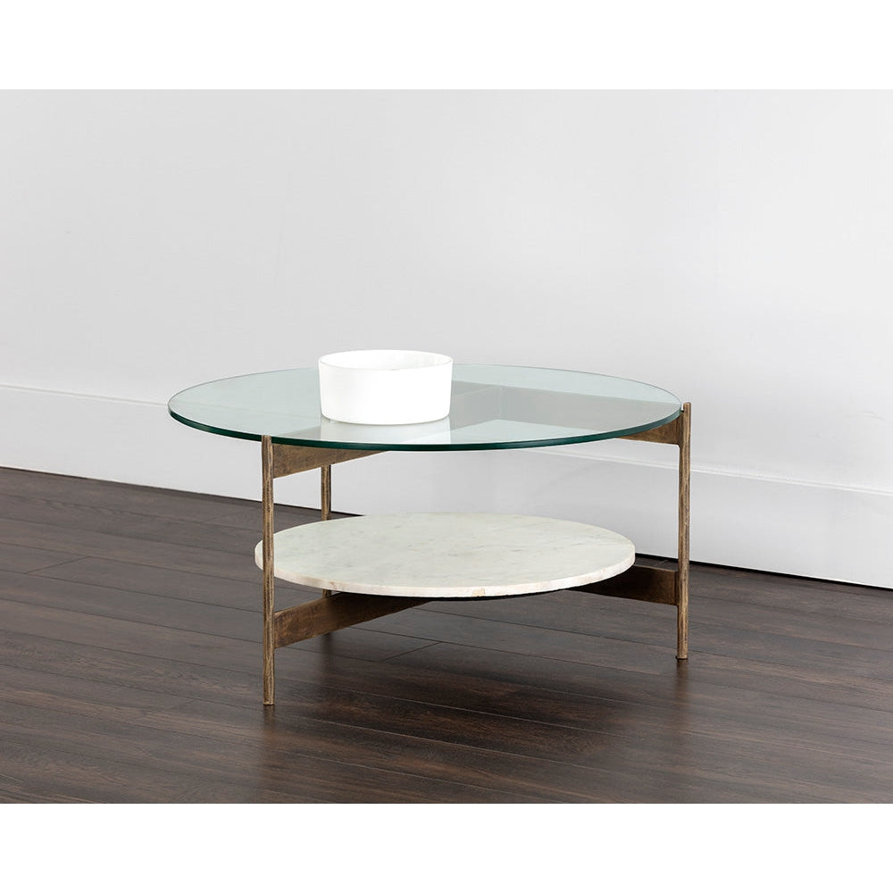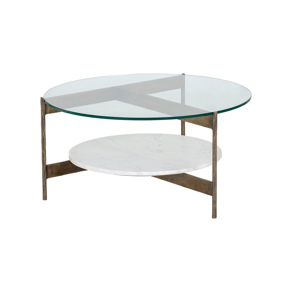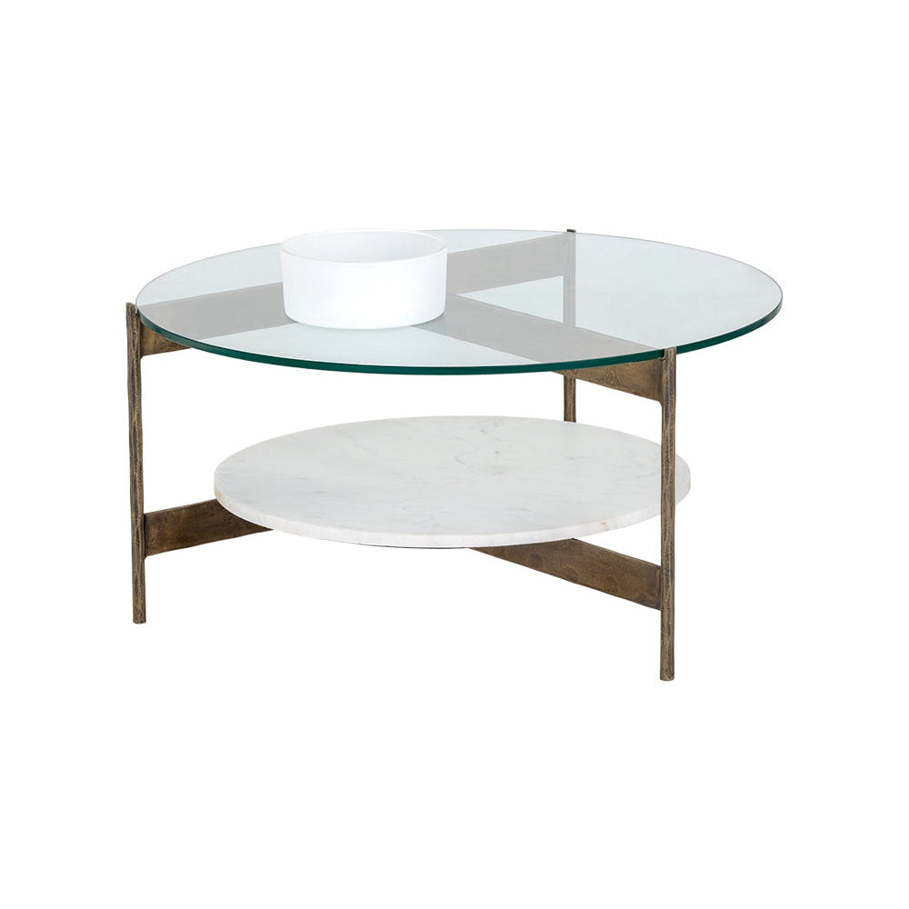 Una mesa de centro escalonada que presenta una rica combinación de materiales, lo que le da un aspecto espectacular. Cuenta con una superficie redonda de vidrio templado transparente y un estante de mármol blanco para mayor almacenamiento y exhibición de decoración. Se completa con una estructura de hierro martillado con acabado de latón antiguo. Hecha en la India. Con una refinada artesanía, este diseño fue creado por hábiles artesanos locales. Por naturaleza, estos materiales desarrollan imperfecciones únicas, como fisuras, marcas y variaciones de color, creando una pieza verdaderamente única.