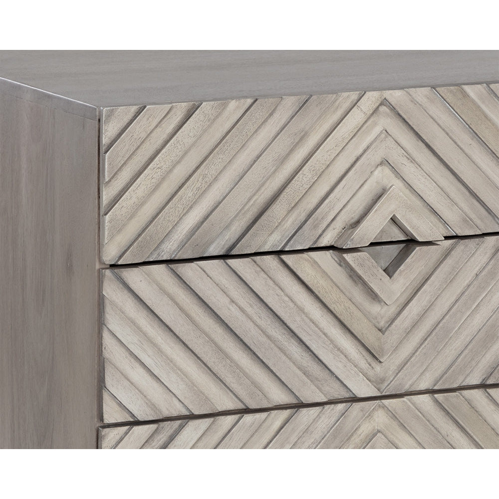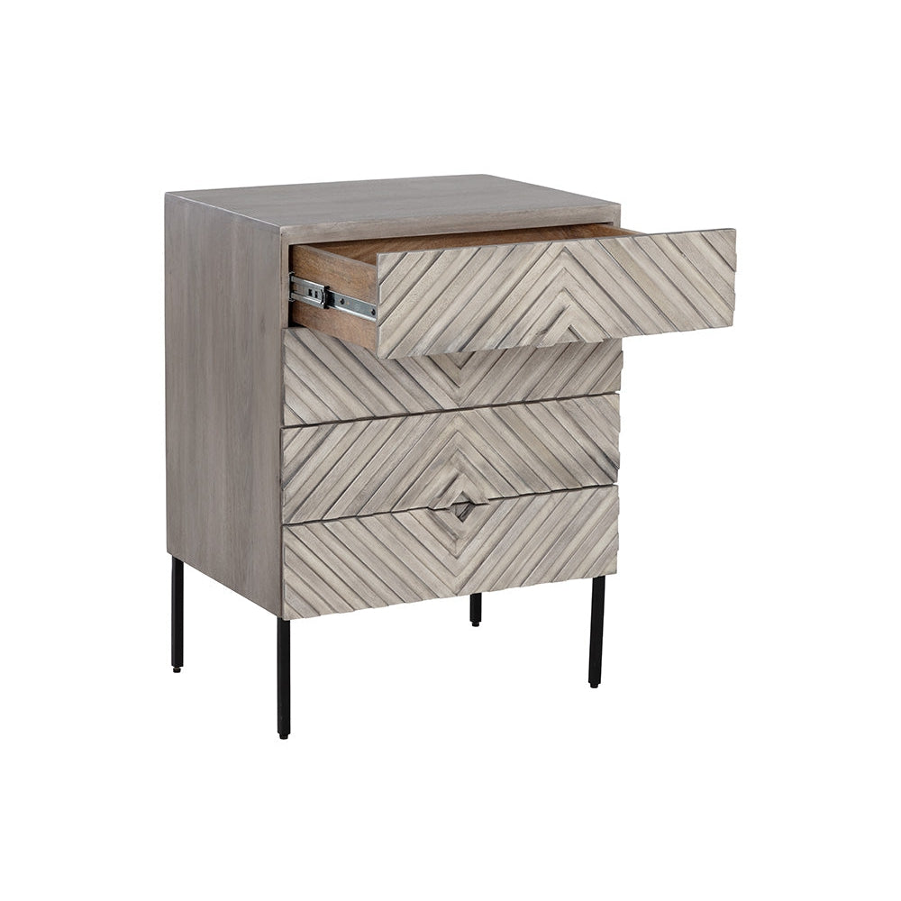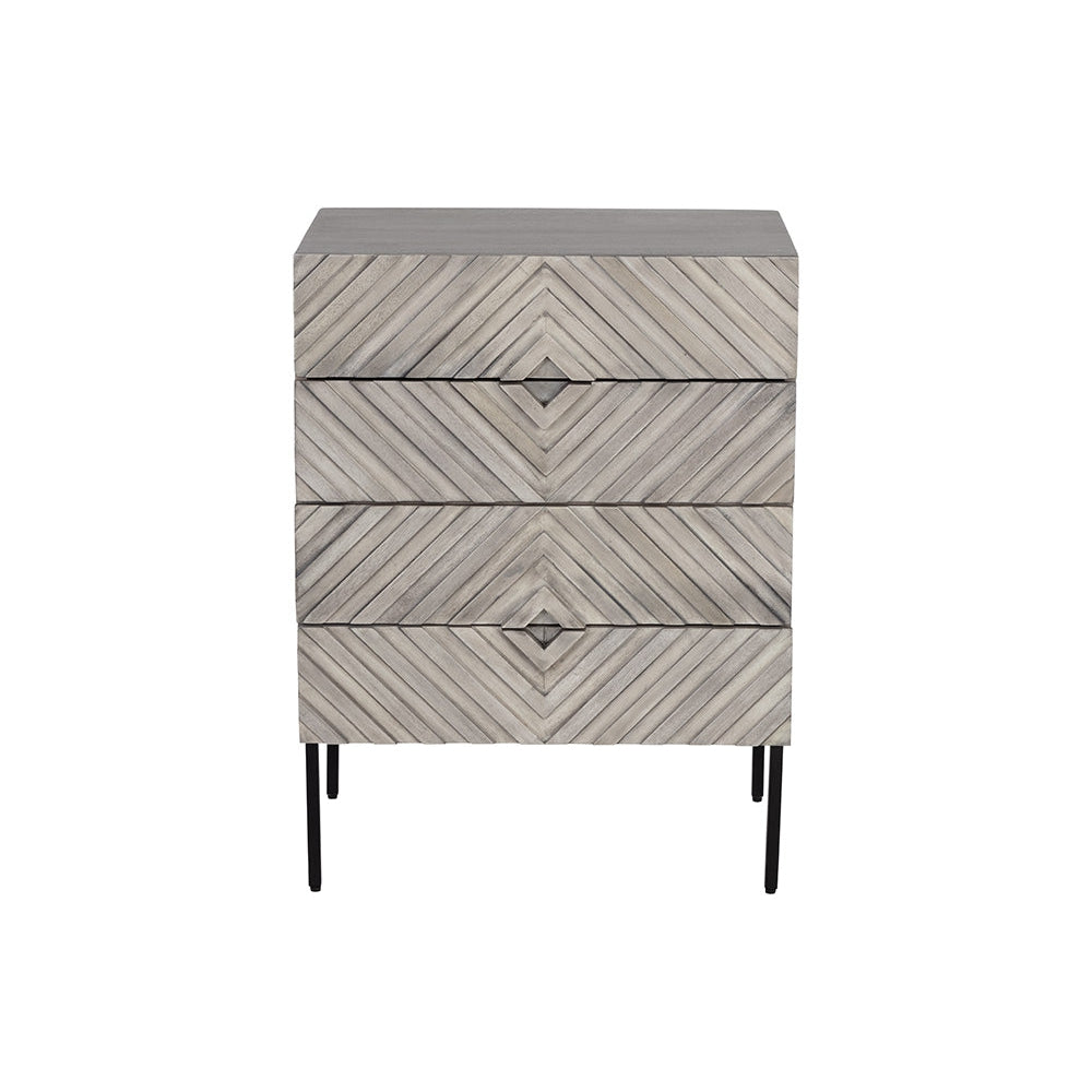 Dale un toque exótico a cualquier dormitorio con esta mesita de noche inspirada en viajes por el mundo. Fabricada en madera maciza de mango gris con un patrón de chevrones artesanal. Incluye cuatro cajones y una base de acero con recubrimiento en polvo negro. Fabricada en la India: Con una refinada artesanía, este diseño fue creado por hábiles artesanos locales. Por naturaleza, estos materiales desarrollan imperfecciones únicas, como fisuras, marcas y variaciones de color, creando una pieza verdaderamente única.