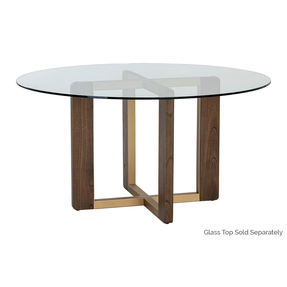 Una hermosa base para mesa de comedor que contrasta con la madera maciza de mindi marrón y un acabado de hierro dorado. Ideal para mesas de comedor con tablero de vidrio redondo de 140 cm, o para mesas rectangulares con dos bases y tablero de vidrio de 244 cm. Los tableros se venden por separado. Diseñado exclusivamente para tableros de vidrio.