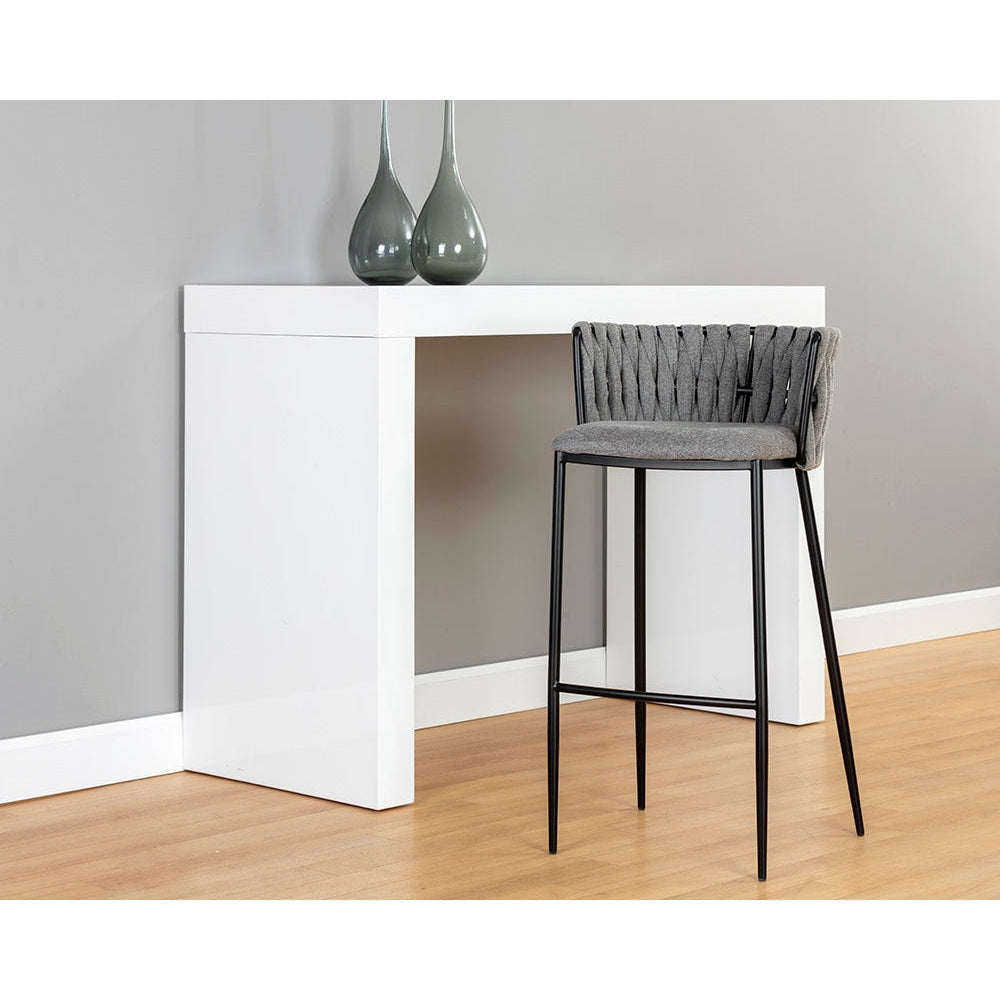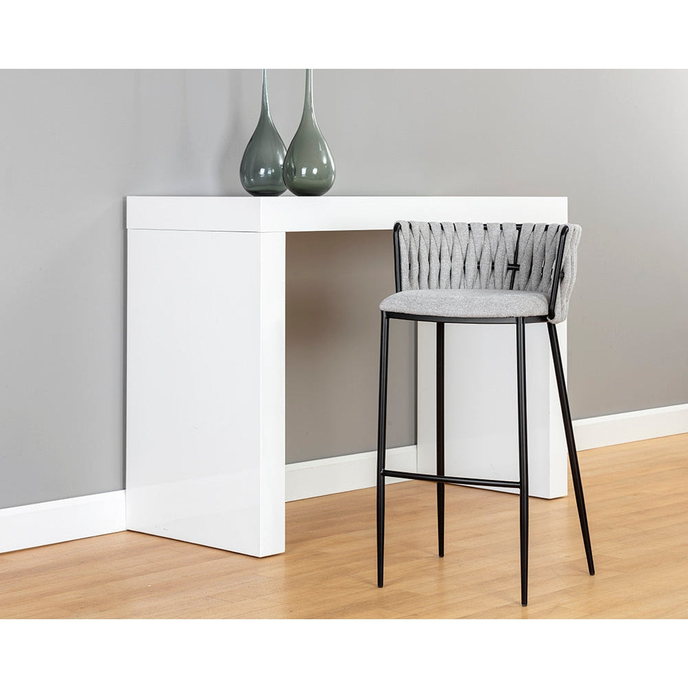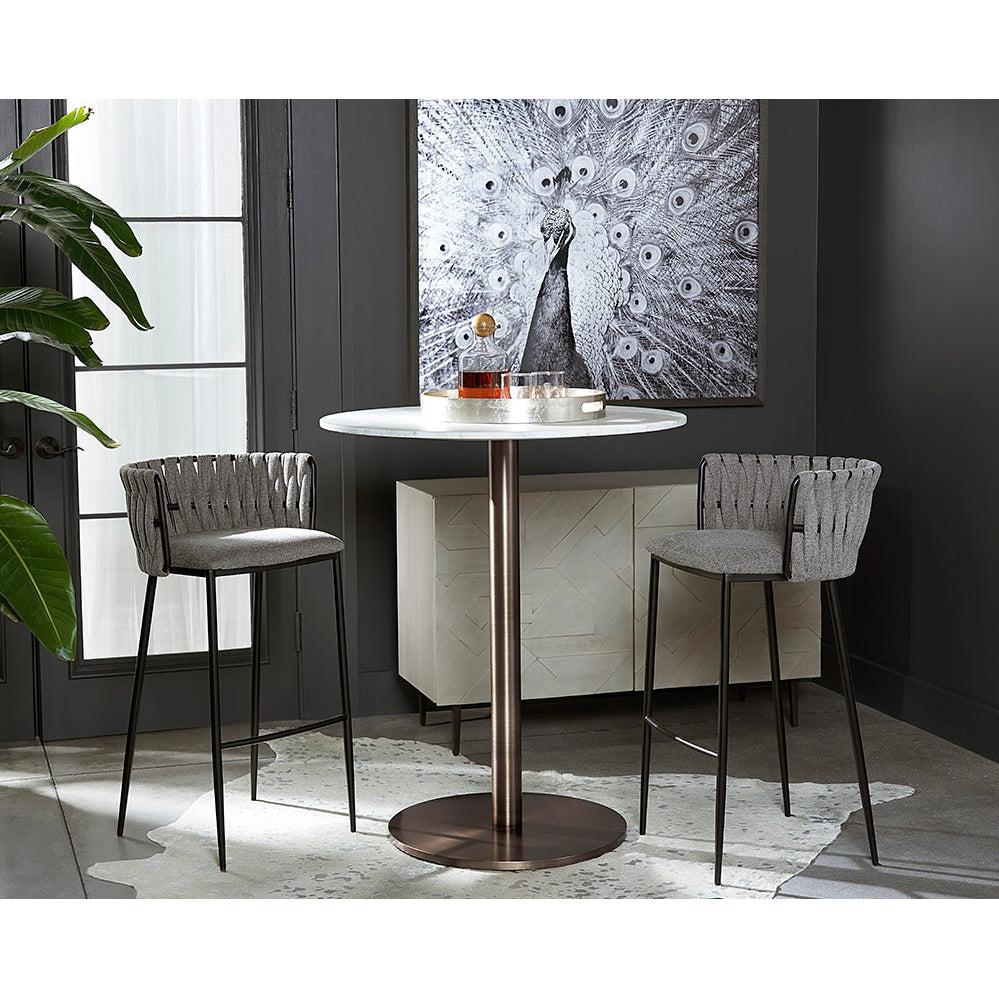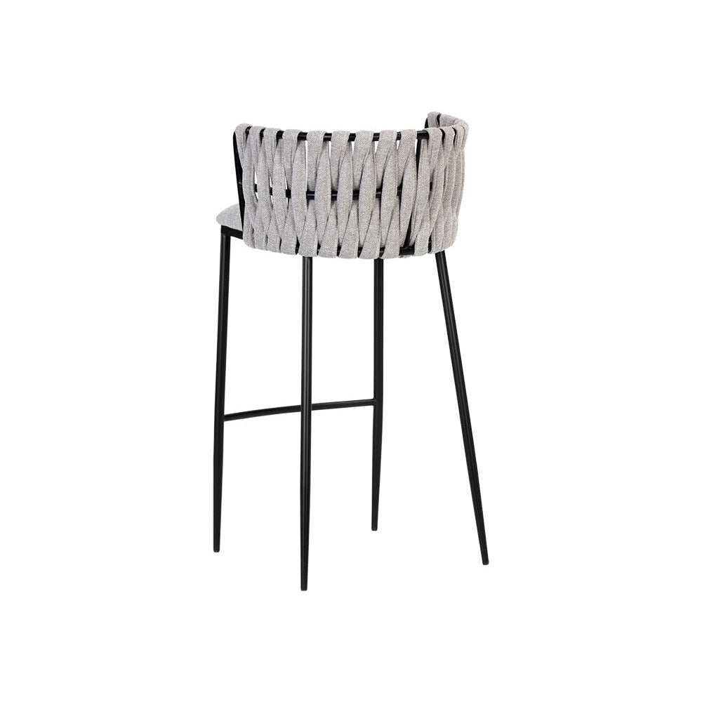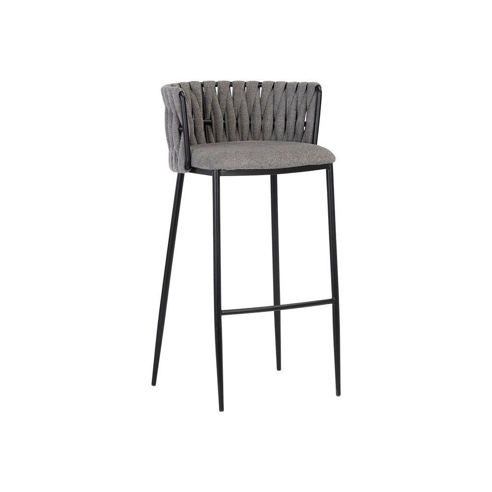 Audaz y original, este taburete de bar contemporáneo presenta un diseño llamativo que aportará dramatismo a cualquier espacio. Fabricado con un exclusivo respaldo tejido, tapizado en nuestras telas Belfast gris koala y gris jaspeado, cuenta con una estructura de acero con recubrimiento en polvo negro y un acabado liso.