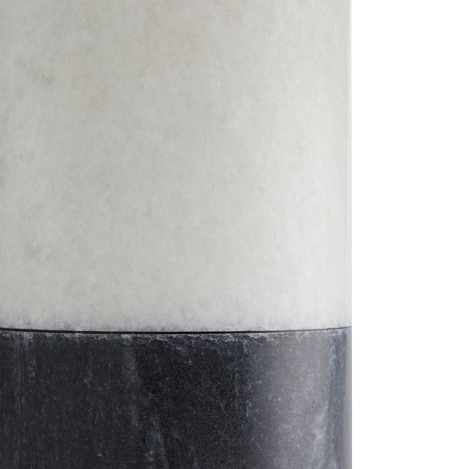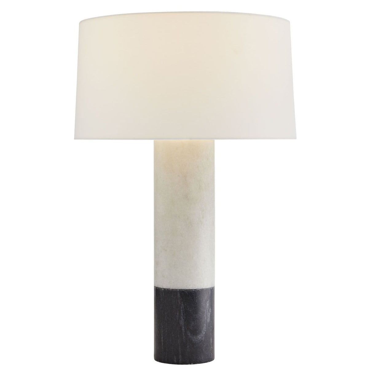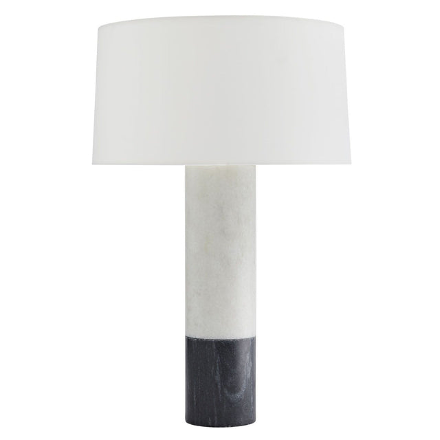 Esta moderna lámpara exhibe elementos de inspiración arquitectónica. Su sólida base de mármol presenta una silueta uniforme de columna de piedra monolítica en blanco y negro clásico. Está rematada con una pantalla de tambor de algodón blanco roto con forro de algodón blanco roto y un remate de mármol a juego. El mármol puede variar.
