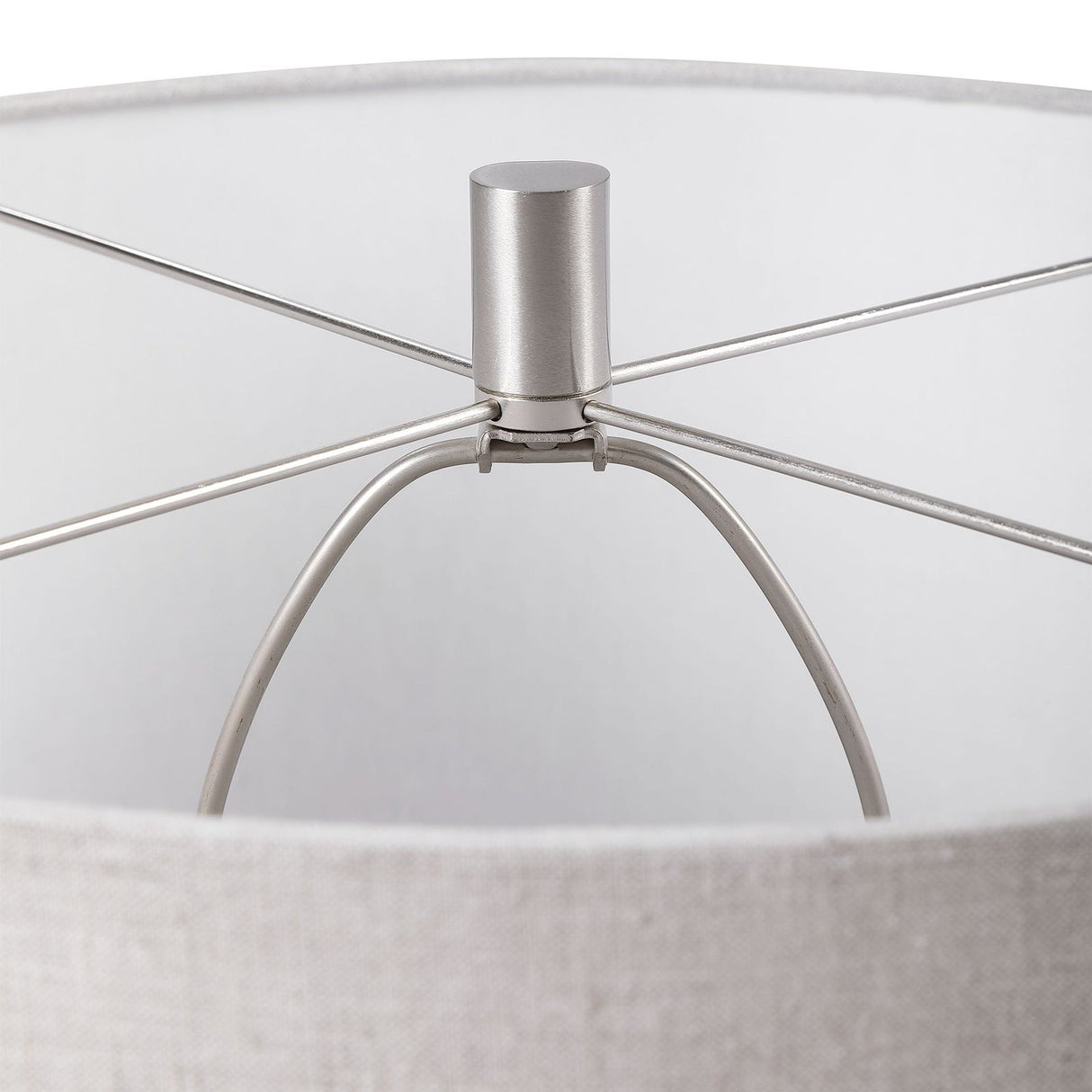 - Hermosa y funcional, esta lámpara de mesa cuenta con una base de vidrio con acabado en un blanco envejecido moteado muy texturizado, acentuado por detalles niquelados cepillados.