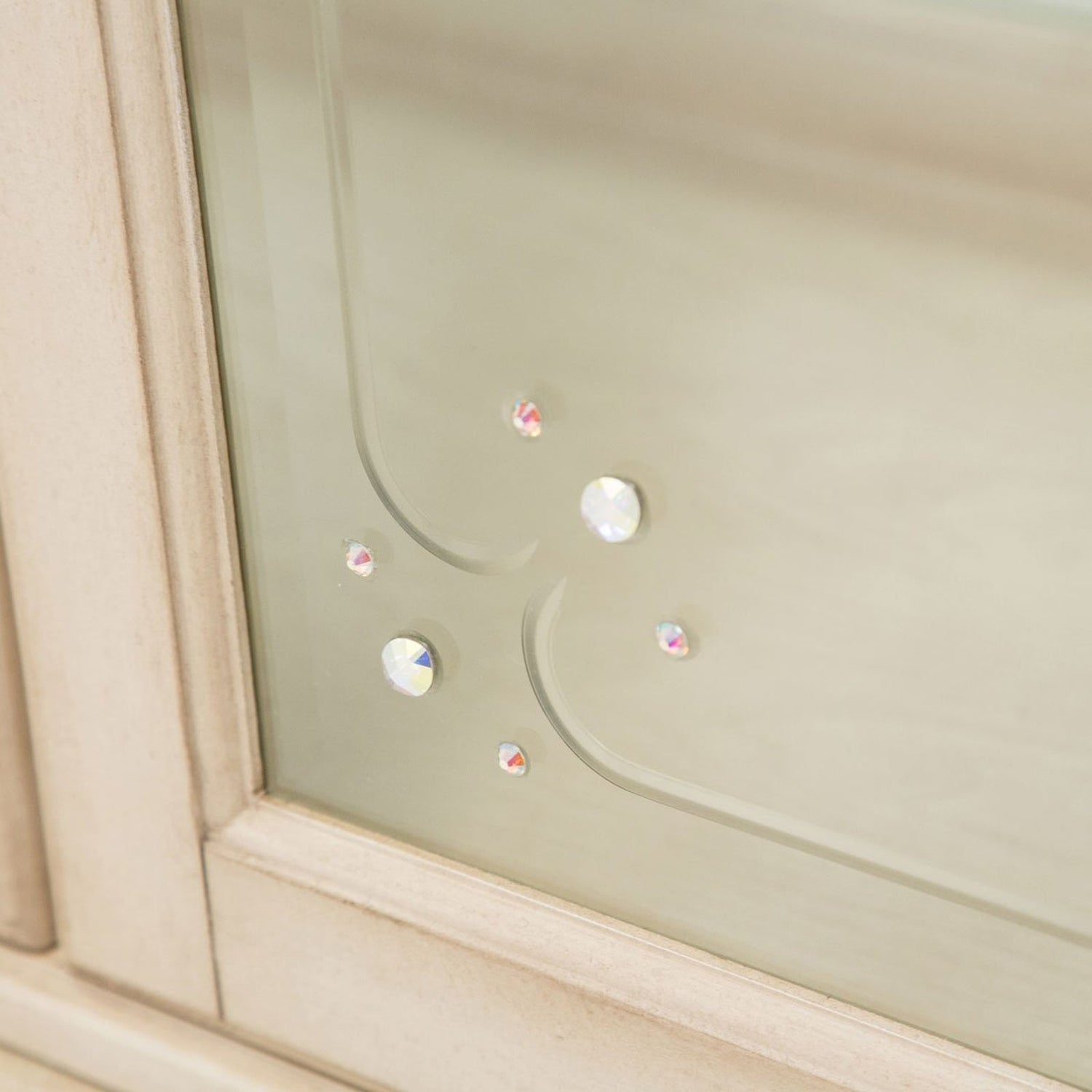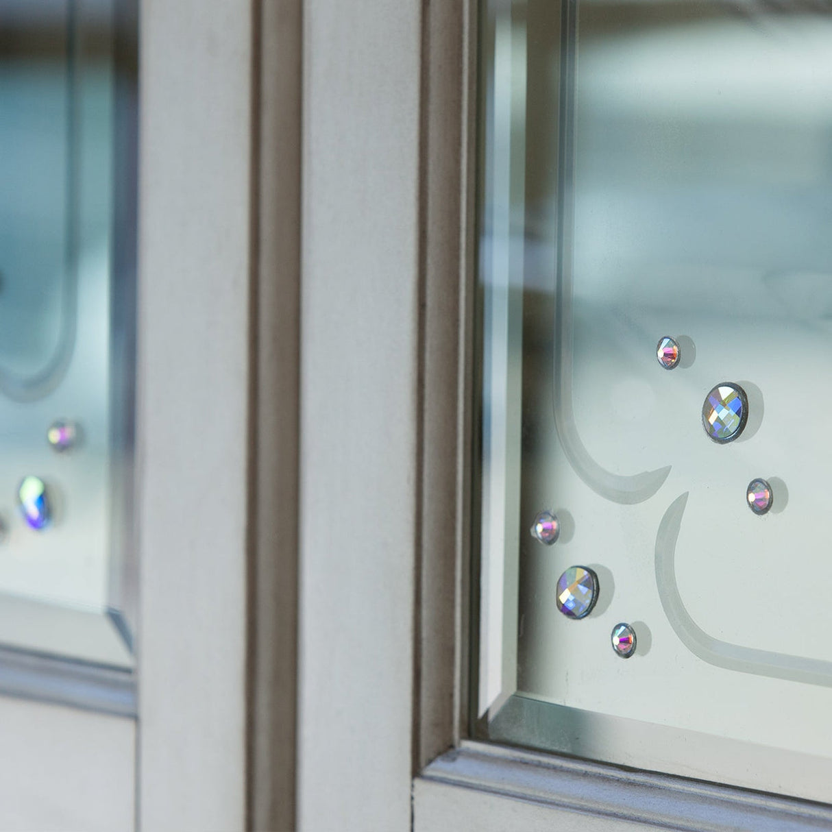 - Puertas de vidrio grabado con elegantes detalles florales y cristales incrustados.