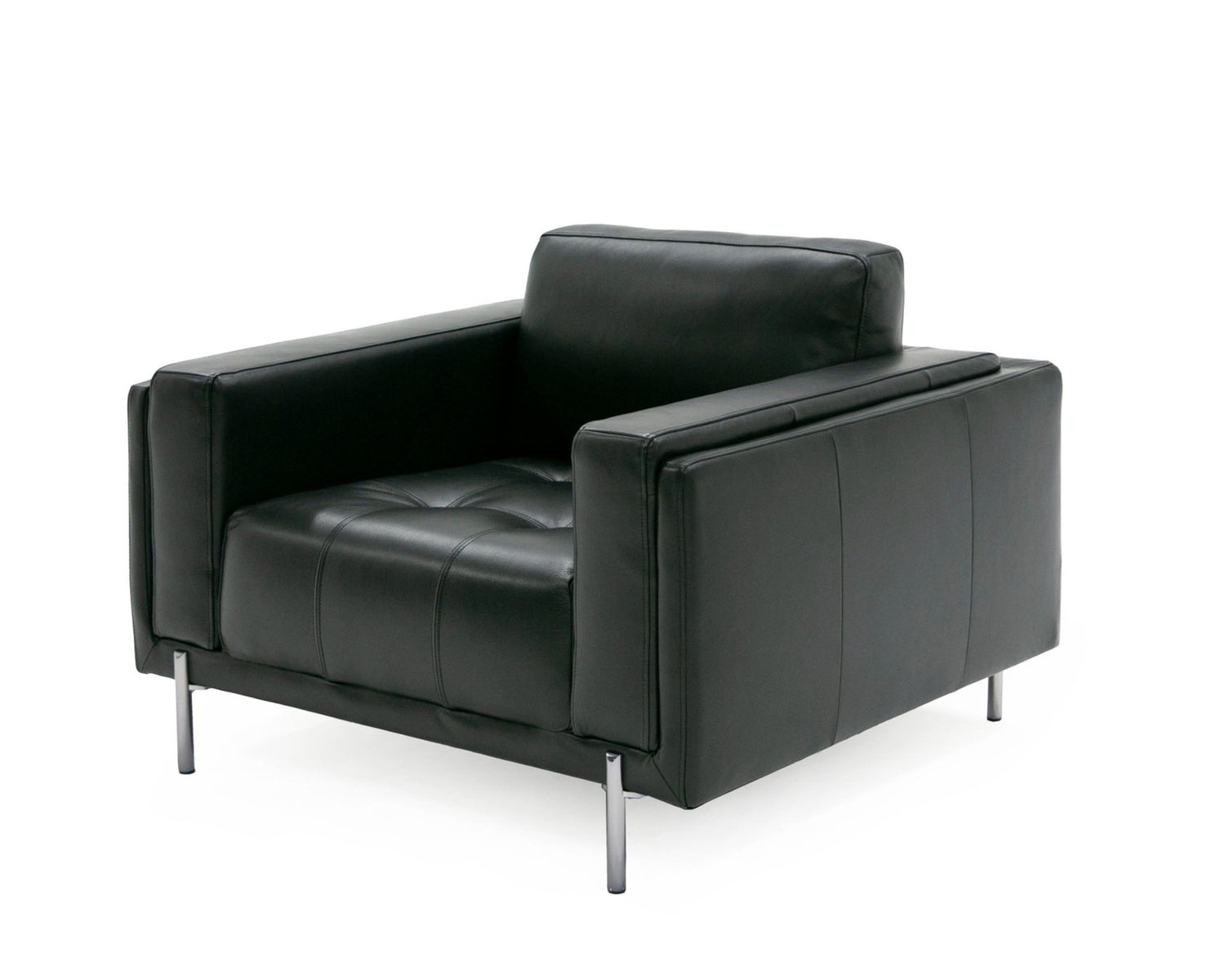 La silla Schmidt, parte de la colección Divani Casa, presenta una silueta baja y estilizada con brazos cuadrados Tuxedo. Un asiento muy cómodo de estilo clásico moderno, tapizado en cuero negro y con patas de metal gris. La Schmidt combina a la perfección con el sofá a juego.