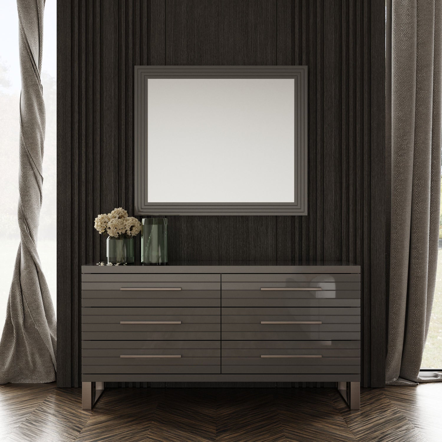 The Splendor Silver & Grey Velvet Upholstered King Platform Bed Set by VIG Furniture delivers refined modern elegance through plush materials and architectural balance. Upholstered in luxurious grey velvet, the platform bed includes slatted support so no box spring is required. Coordinating high-gloss casegoods with soft-closing drawers complete a bedroom designed for comfort, security, and lasting style.