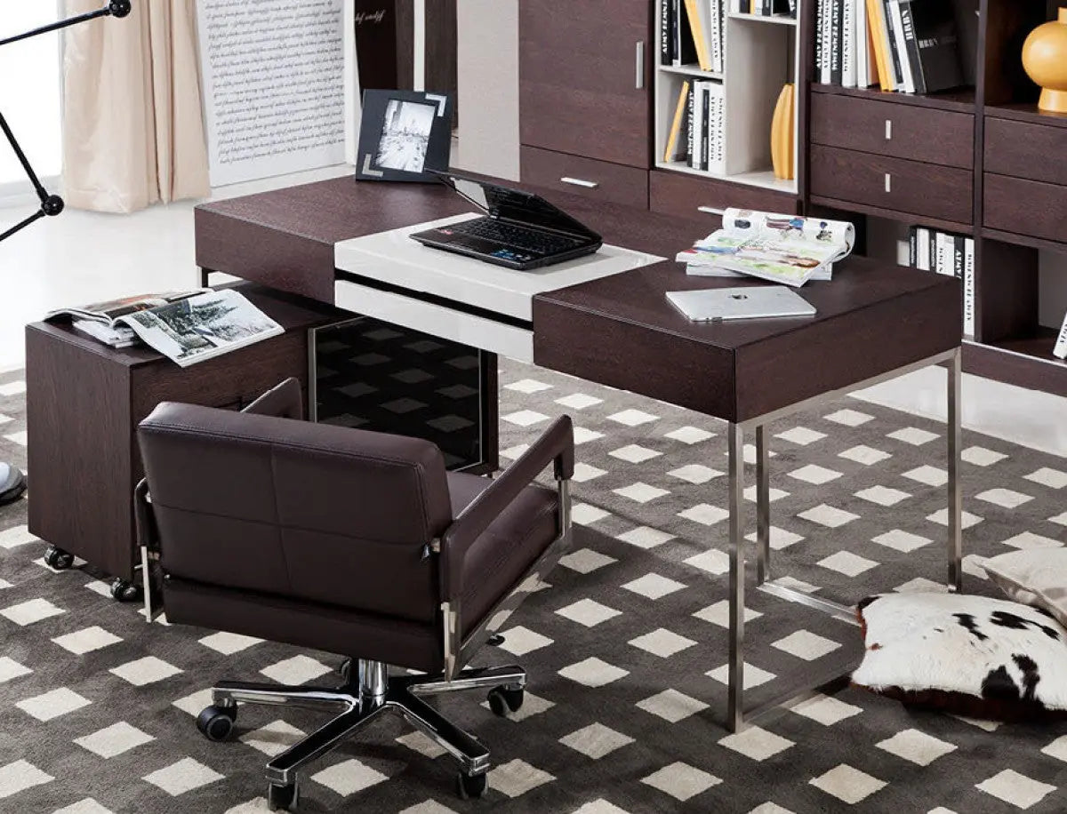 El moderno escritorio de oficina Modrest Ezra, con armario lateral, presenta líneas limpias y suaves, con un toque de melamina blanca en la mesa de roble marrón con acabado gris brillante. Las patas de acero inoxidable le brindan un soporte resistente. El armario de tres cajones en roble marrón incluye un estante tras una puerta corredera de cristal. Sus ruedas facilitan su transporte.