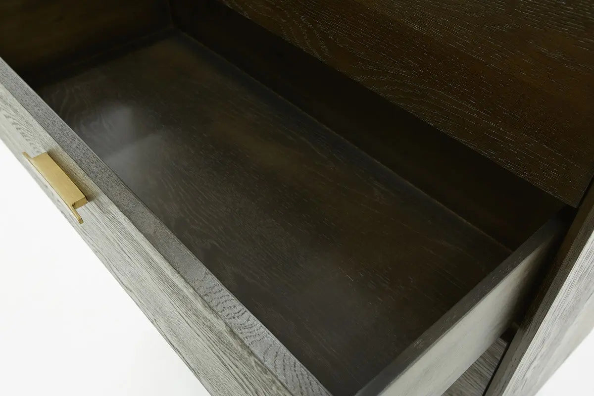 La cómoda moderna Modrest Novak de roble oscuro luce una estructura clásica pero elegante. Equipada con 5 amplios cajones con guías invisibles de movimiento lento, esta cómoda ofrece amplio espacio para organizar tus objetos. Los tiradores de latón antiguo combinan a la perfección con el elegante acabado de chapa de roble lavado en gris oscuro. Tanto la superficie exterior como la interior presentan vetas de madera en diferentes tonos. Para añadir lujo, se utilizó terciopelo negro en el interior del cajón superior. Las patas cónicas de roble macizo proporcionan un soporte resistente. ¡Dile adiós al desorden con esta moderna cómoda de roble oscuro de diseño inteligente!