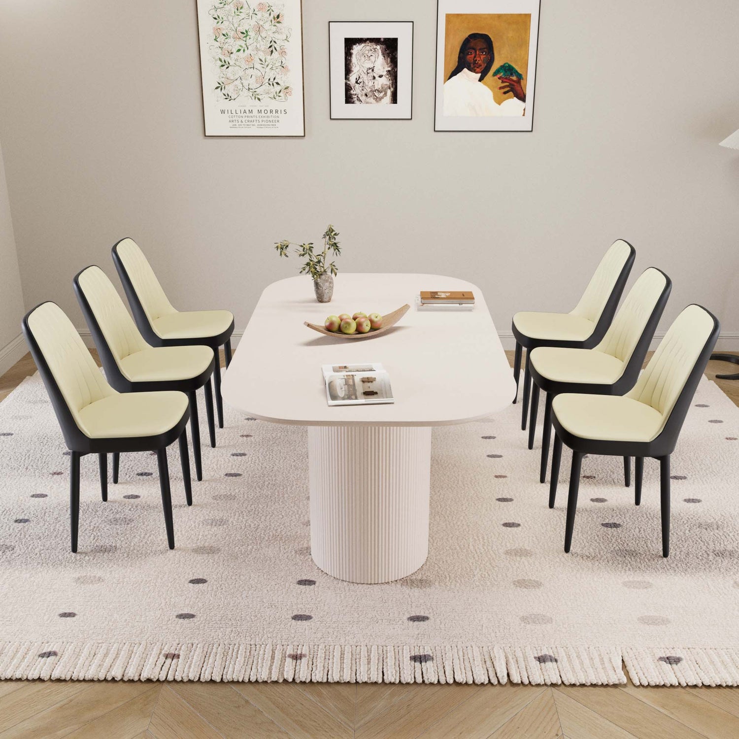 Mesa de comedor de MDF estilo crema medieval moderno de 63 'y juego de sillas de comedor de PU 6. Conjunto de escritorio ensamblado y silla de comedor con patas de metal negro, adecuado para el hogar y la cocina.