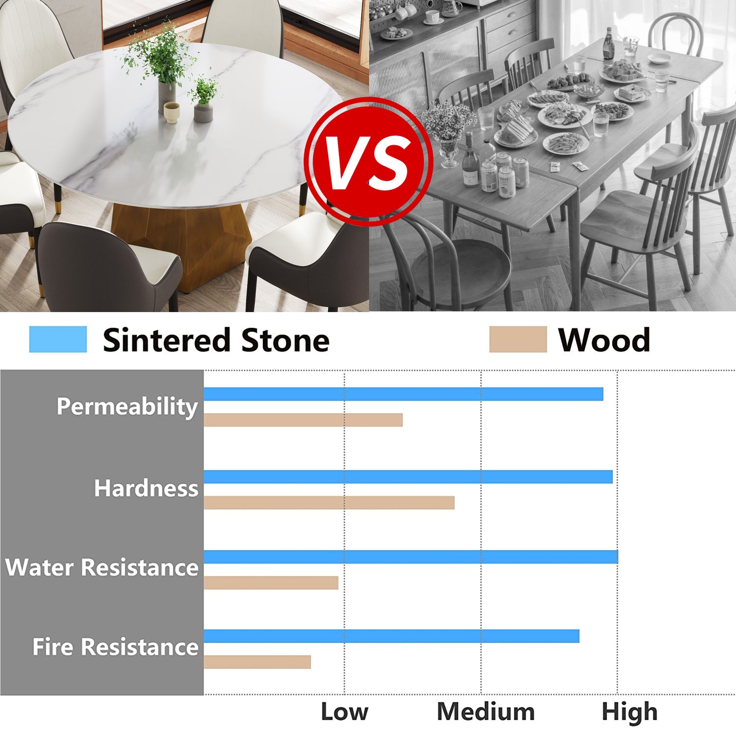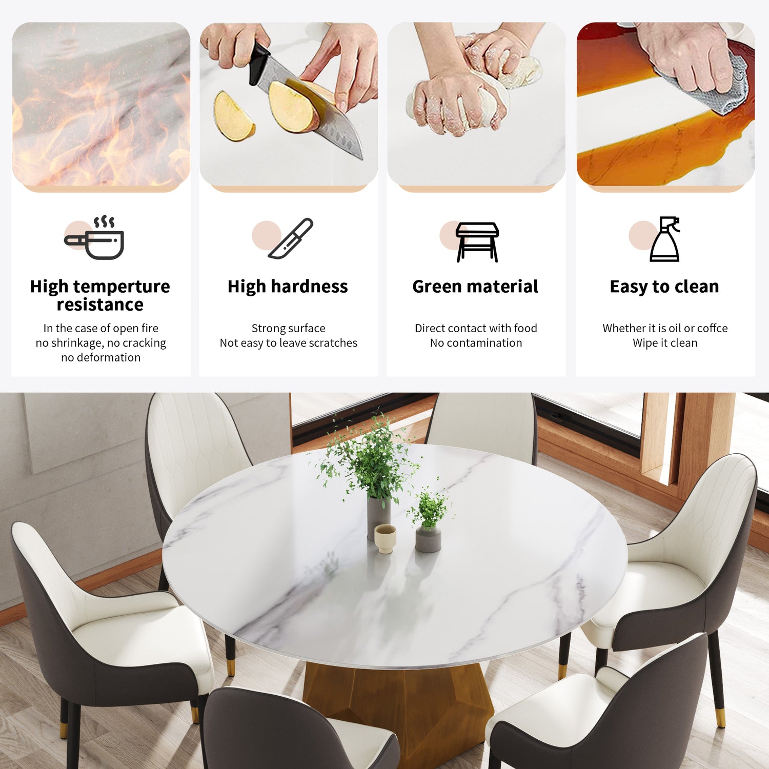 - [Panel de mesa de comedor resistente y fácil de limpiar] El escritorio es una de las superficies más resistentes, hecha de piedra sinterizada, que se prensa en forma de cuchilla tras calentarse, lo que le proporciona un escritorio que durará muchos años. Este material previene quemaduras, manchas y rayones, y es resistente al calor, al fuego y antiincrustante.