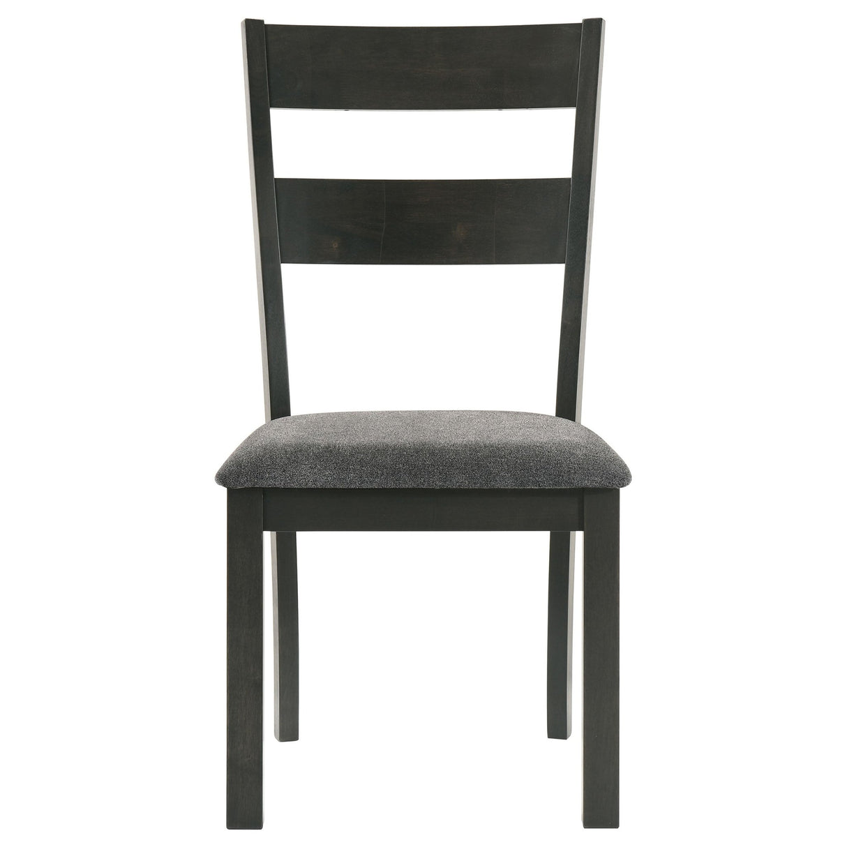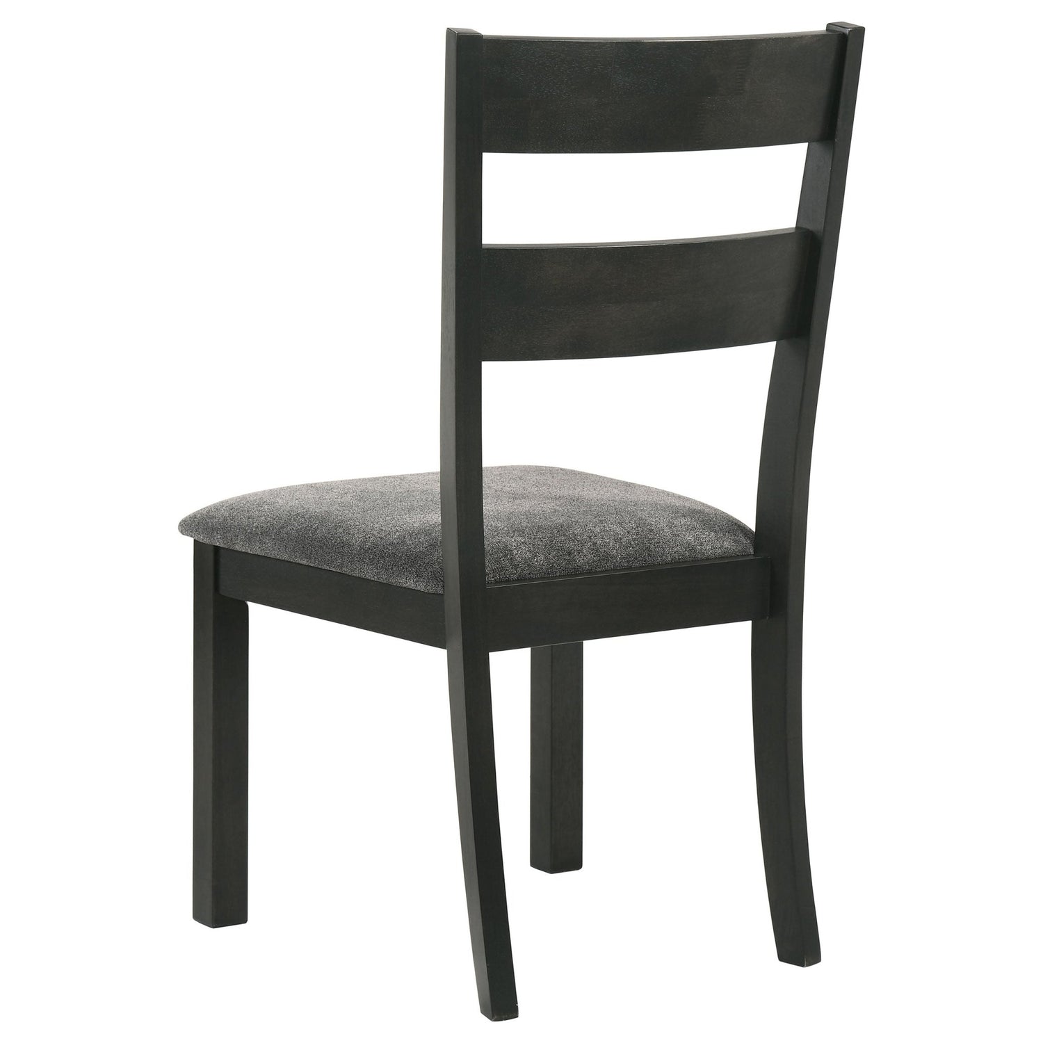Perfecto para una estética minimalista, este juego de comedor de cinco piezas de estilo transicional ofrece un atrevido acabado en negro. Con una espaciosa mesa rectangular y cuatro sillas con respaldo de escalera, este juego invita a la familia a una cena informal, y puede ampliarse con la hoja de mariposa autoguardable de 50 cm para fiestas. Cada silla cuenta con un asiento acolchado y tapizado en una suave tela gris para una comodidad duradera. Las gruesas patas de la mesa, con forma de bloque, imitan las patas de las sillas con respaldo de escalera, uniendo la colección a la perfección. Instálelo en un comedor o casa de estilo rústico moderno para un look audaz.