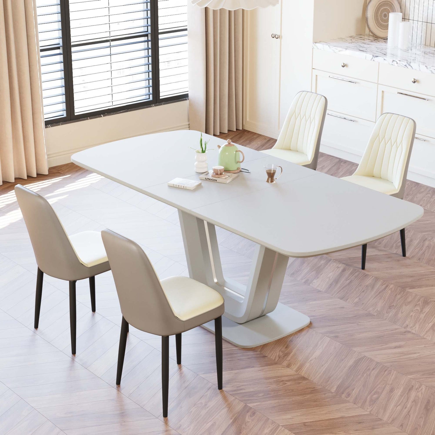 Juego de mesa de comedor expandible de 62,99 a 78,74 pies para 2 a 8 personas, equipado con 4 sillas de comedor acolchadas gruesas de tela de PU y una espaciosa mesa de comedor, mesa de cocina y sillas, con patas de mesa en forma de U