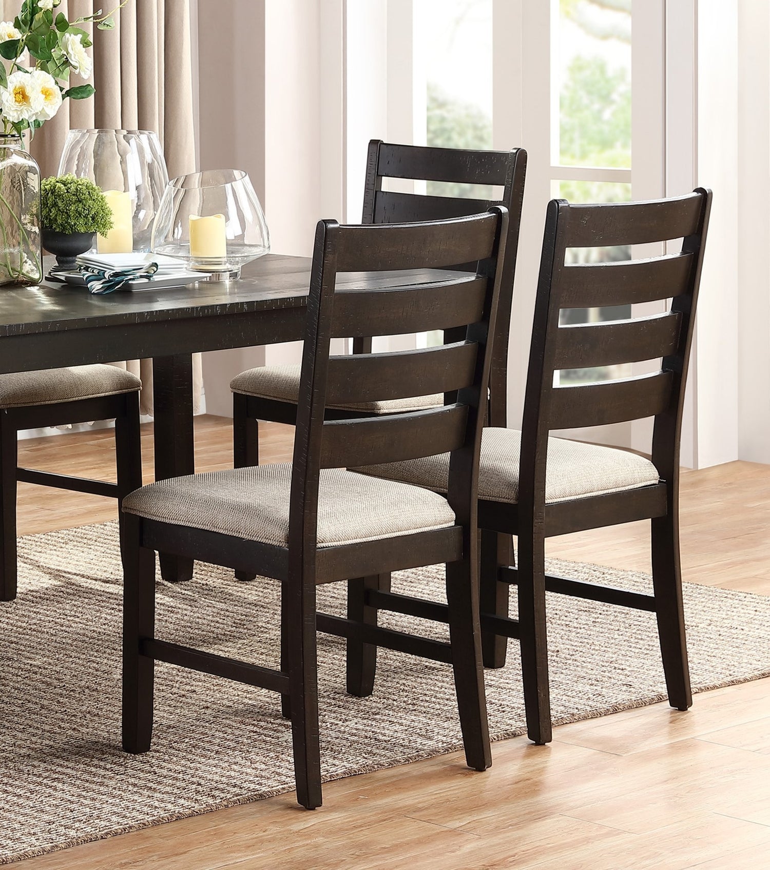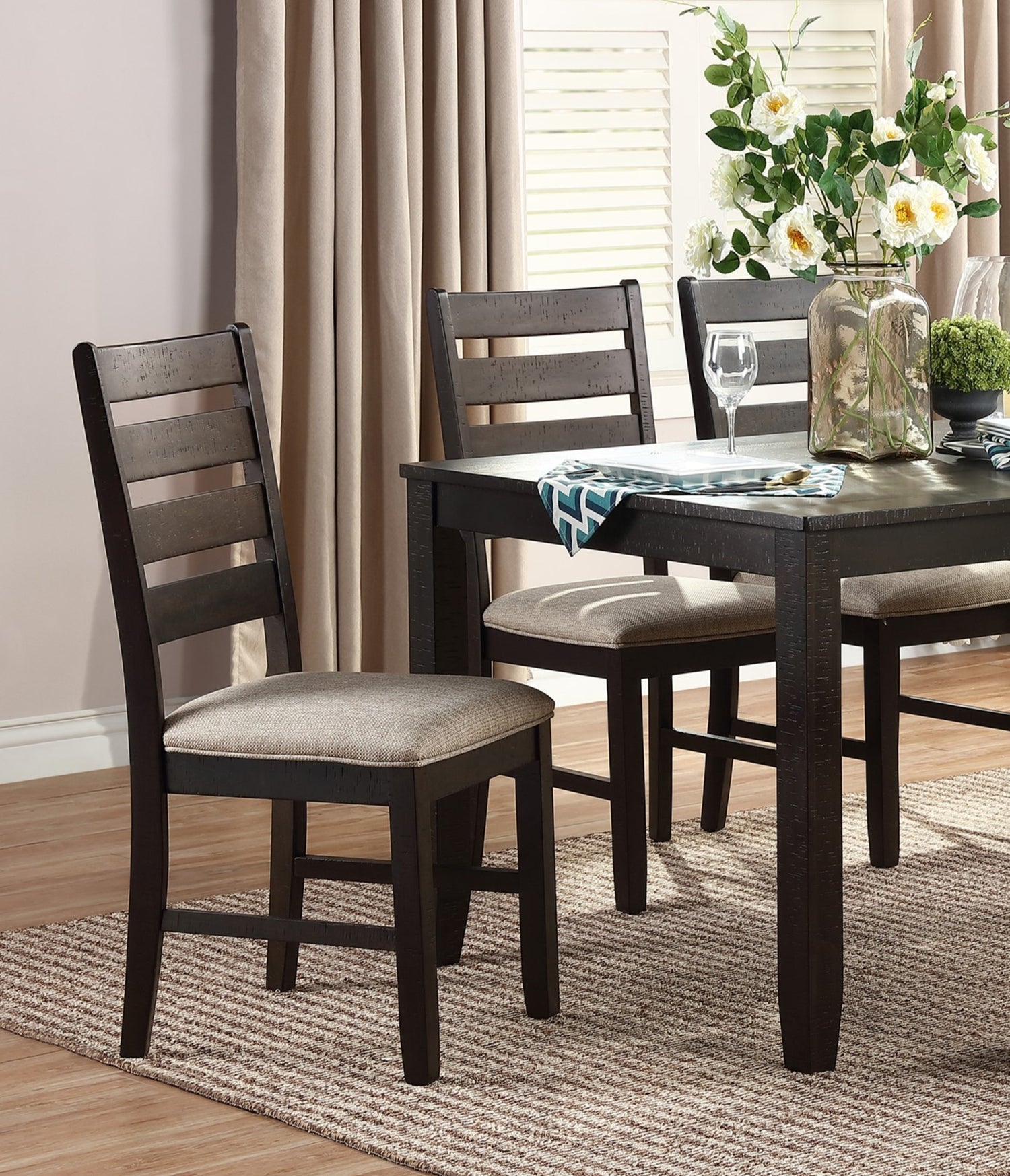Juego de comedor de 7 piezas con mesa y 6 sillas laterales en acabado marrón, tapizado beige, respaldo de escalera, muebles de cocina de madera.