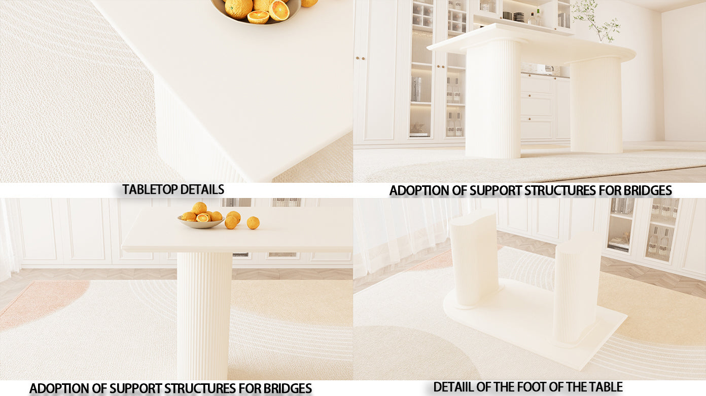 - 2. Mesa de centro con acabado crema: esta mesa presenta un moderno acabado blanco lechoso, con una lujosa superficie color crema y patas gruesas y redondas talladas con patrones delicados como ondas, que agregan un toque de delicadeza a cualquier espacio de comedor.