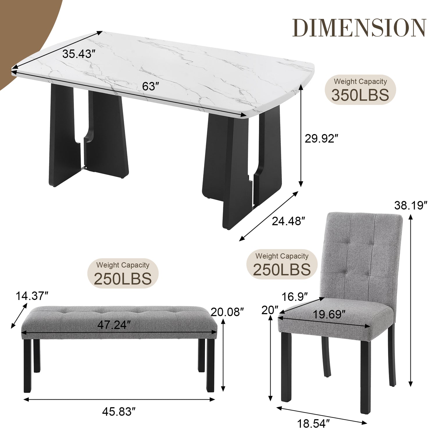 | Dimensiones generales del producto | Mesa de comedor: 63 x 35,43 x 29,92 pulgadas, 120,59 libras Silla de comedor: 16,9 x 19,69 x 38,19 pulgadas, 16,54 libras por silla 16,9' es la profundidad del asiento, la profundidad total es 24,8' Banco: 47,24 x 14,37 x 20,08 pulgadas, 21,5 libras |