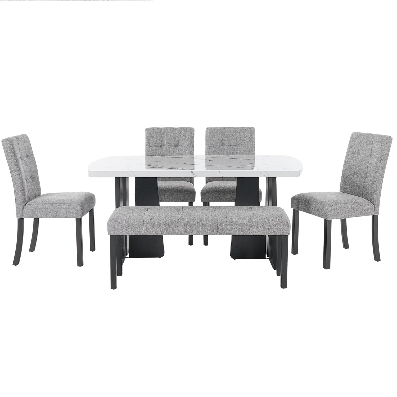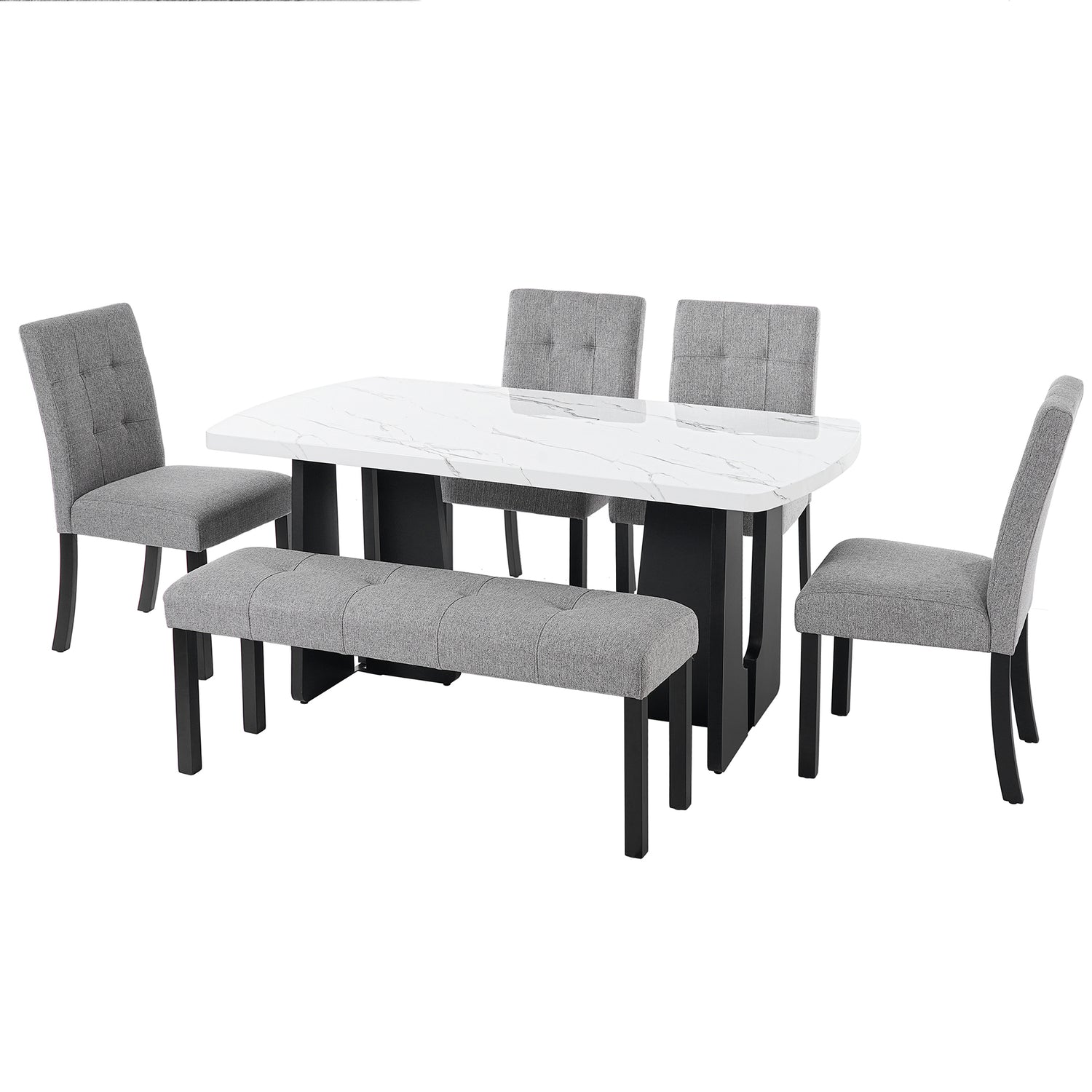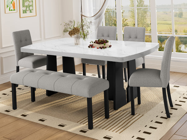 Juego de mesa de comedor moderna de 6 piezas, mesa de comedor de 16 m de imitación de mármol con patas geométricas, 4 sillas tapizadas y 1 banco, ideal para comedor o cocina, fácil de montar, blanco y gris.