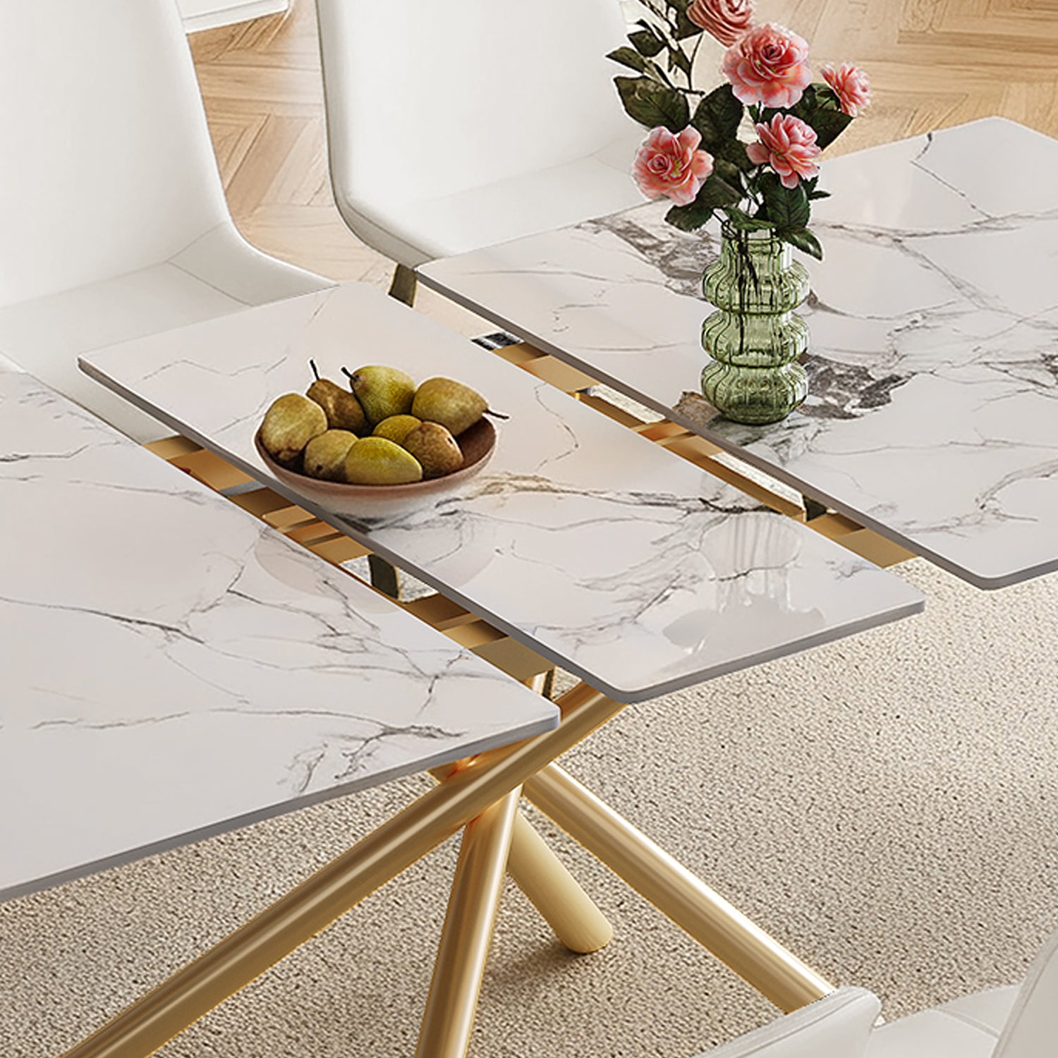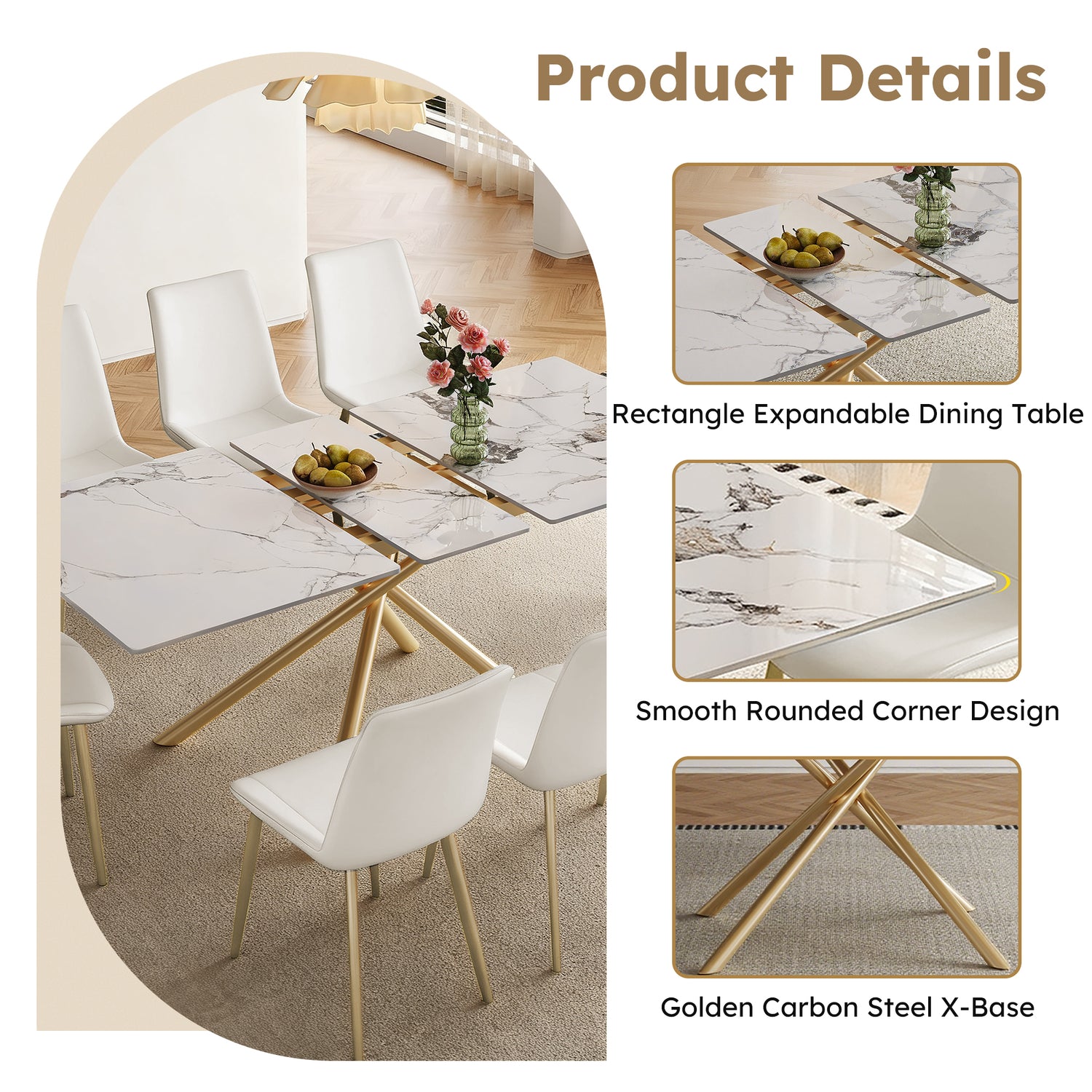 59-inch Modern rectangle Expandable Dining Table with Retractable Leaf, Charred Stone Top & Golden Carbon Steel X-Base, 8 Person Sturdy Table Set with 8 White PU Chairs for Small Apartments, Kitchen