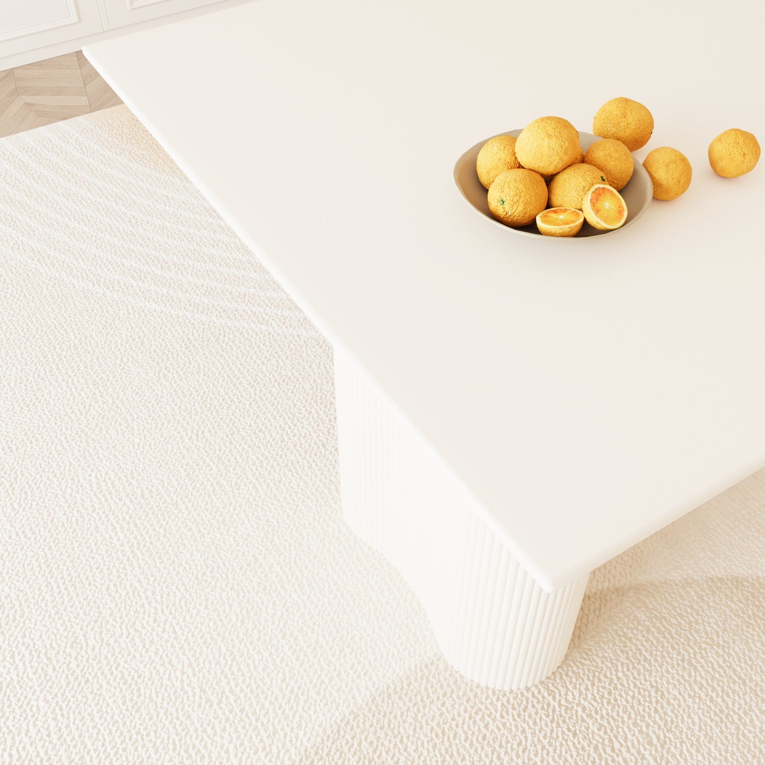 - 2. Mesa de centro con acabado crema: esta mesa presenta un moderno acabado blanco lechoso, con una lujosa superficie color crema y patas gruesas y redondas talladas con patrones delicados como ondas, que agregan un toque de delicadeza a cualquier espacio de comedor.