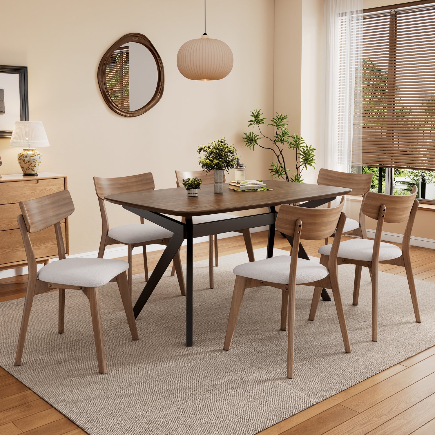 - Estilo moderno de mediados de siglo: con líneas elegantes y patas abiertas, este juego de comedor combina el encanto atemporal de mediados de siglo con la funcionalidad moderna, creando un punto focal elegante para cualquier espacio de comedor.