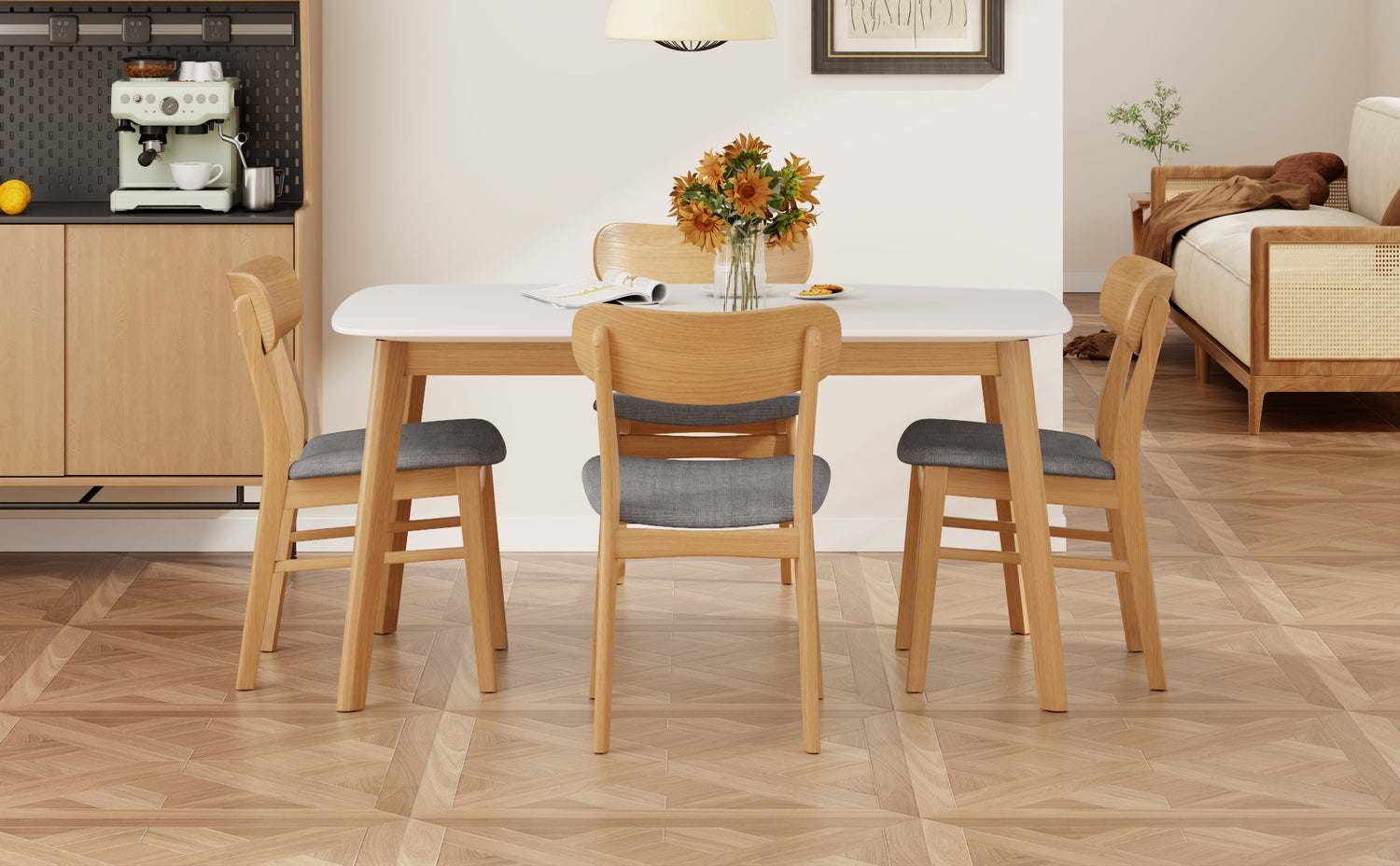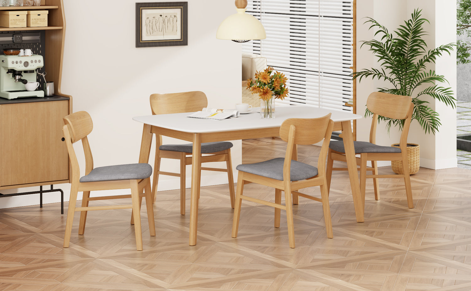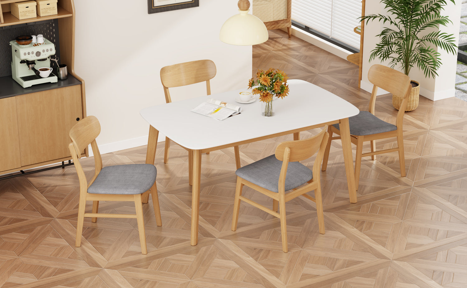 - Elegancia moderna de mediados de siglo: Inspirado en el diseño moderno de mediados de siglo, este conjunto presenta tonos cálidos de roble blanco combinados con tapicería gris para una apariencia suave y acogedora. Las líneas limpias, las patas de mesa acampanadas y los perfiles minimalistas de las sillas aportan una elegante simplicidad a cualquier comedor, integrándose a la perfección con la decoración moderna, rústica o de transición. La paleta de colores neutros complementa los muebles existentes y aporta un toque de estilo sutil.
