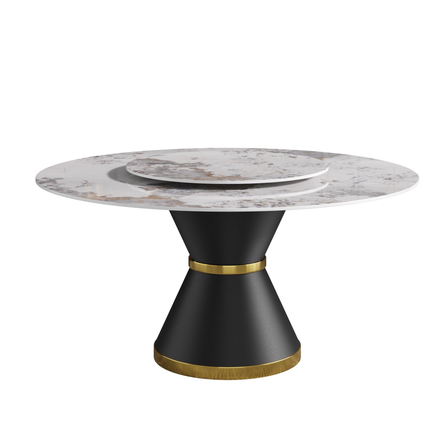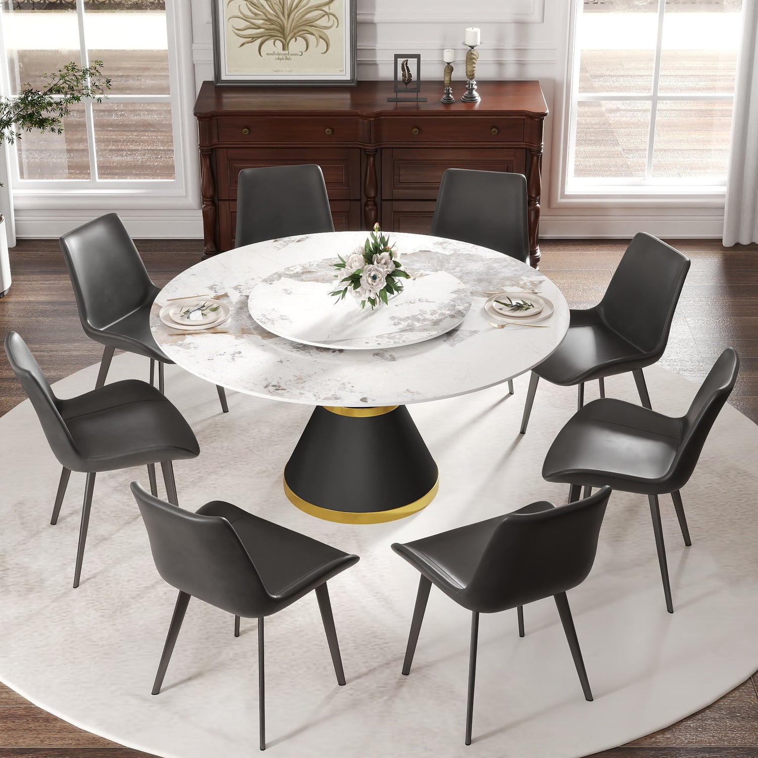 Mesa de comedor moderna de piedra artificial redonda de 170 cm con base de acero al carbono negro y plato giratorio de piedra artificial blanca de 95 cm. Capacidad para 6-8 personas (con 8 sillas).