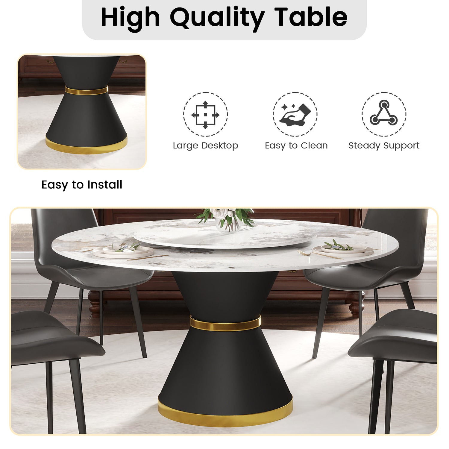 - [Base estable] Esta mesa de comedor adopta una base de acero al carbono negro, que es dura y estable para las grandes ventajas, y puede mantener el nivel de toda la mesa del comedor.