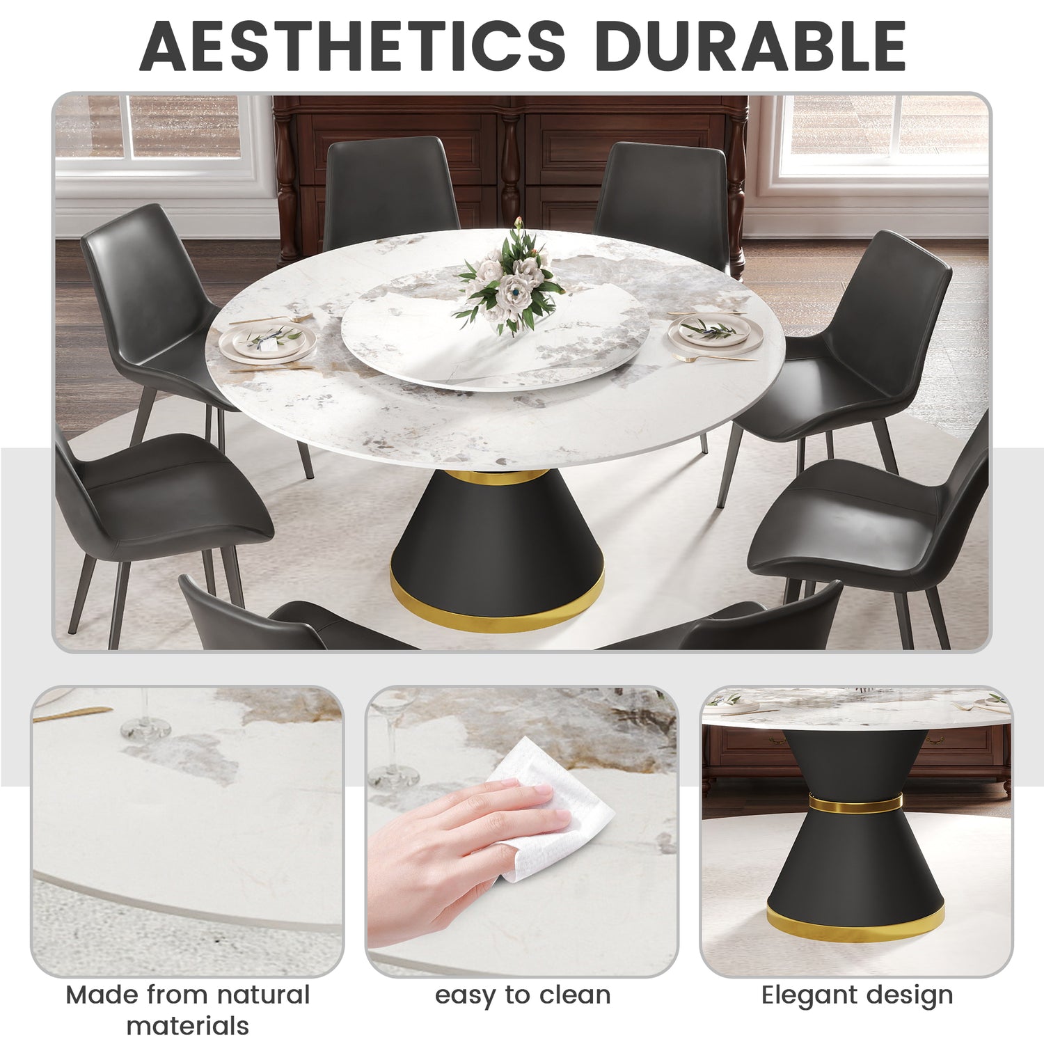 - [Panel de mesa de comedor resistente y fácil de limpiar] El escritorio es una de las superficies más resistentes, hecha de piedra sinterizada, que se prensa en forma de cuchilla tras calentarse, lo que le proporciona un escritorio que durará muchos años. Este material previene quemaduras, manchas y rayones, y es resistente al calor, al fuego y antiincrustante.