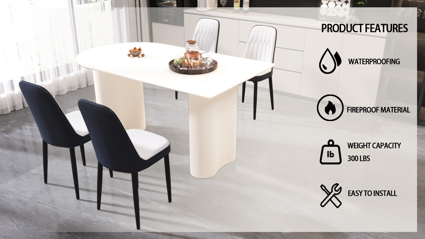 Mesa de comedor de MDF estilo crema medieval moderno de 63 'y juego de sillas de comedor de PU 4. Conjunto de escritorio ensamblado y silla de comedor con patas de metal negro, adecuado para el hogar y la cocina.