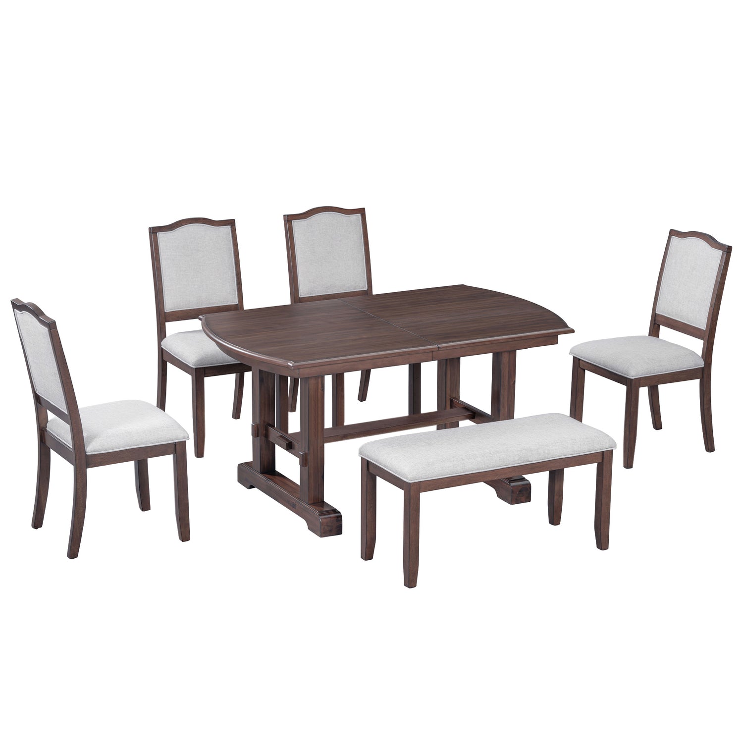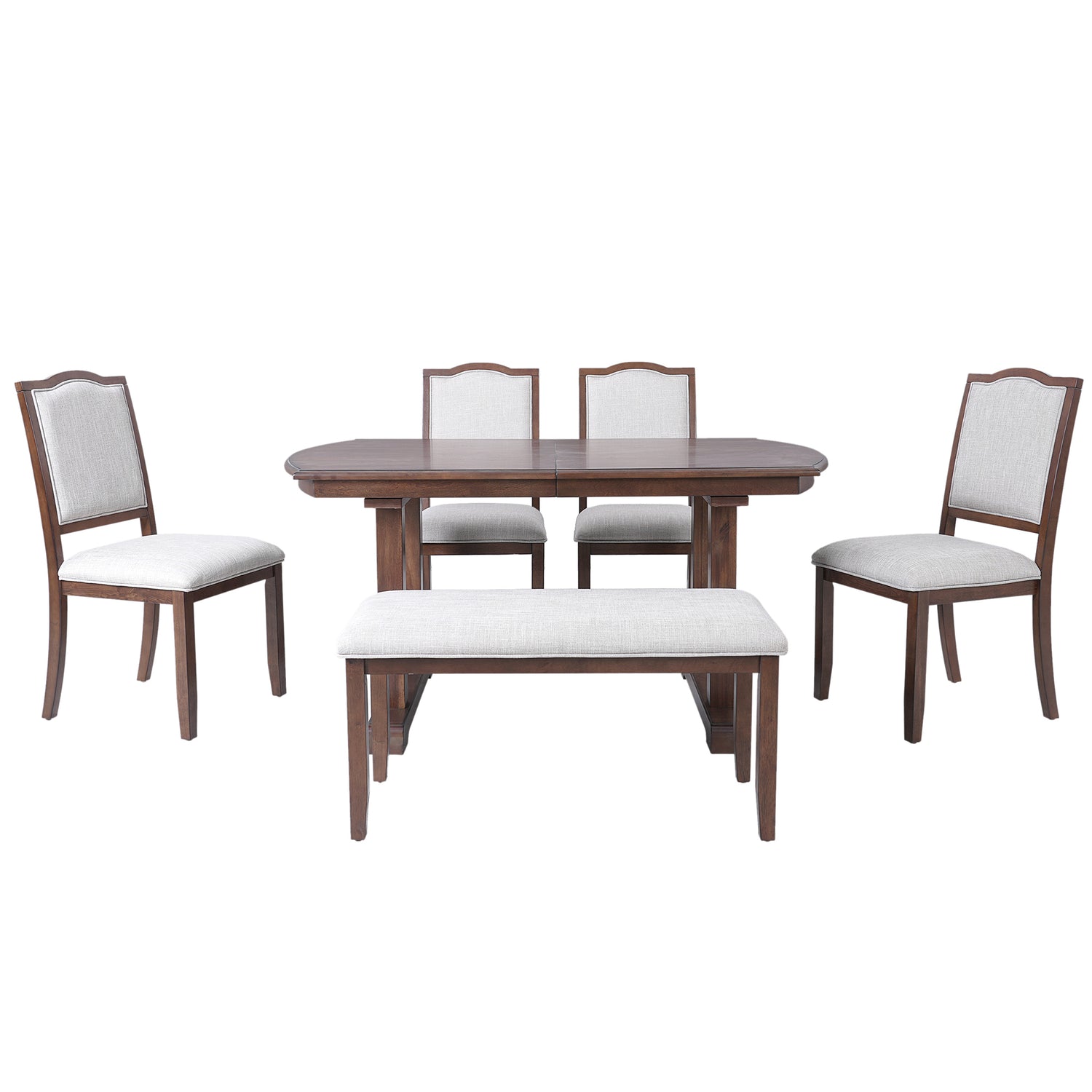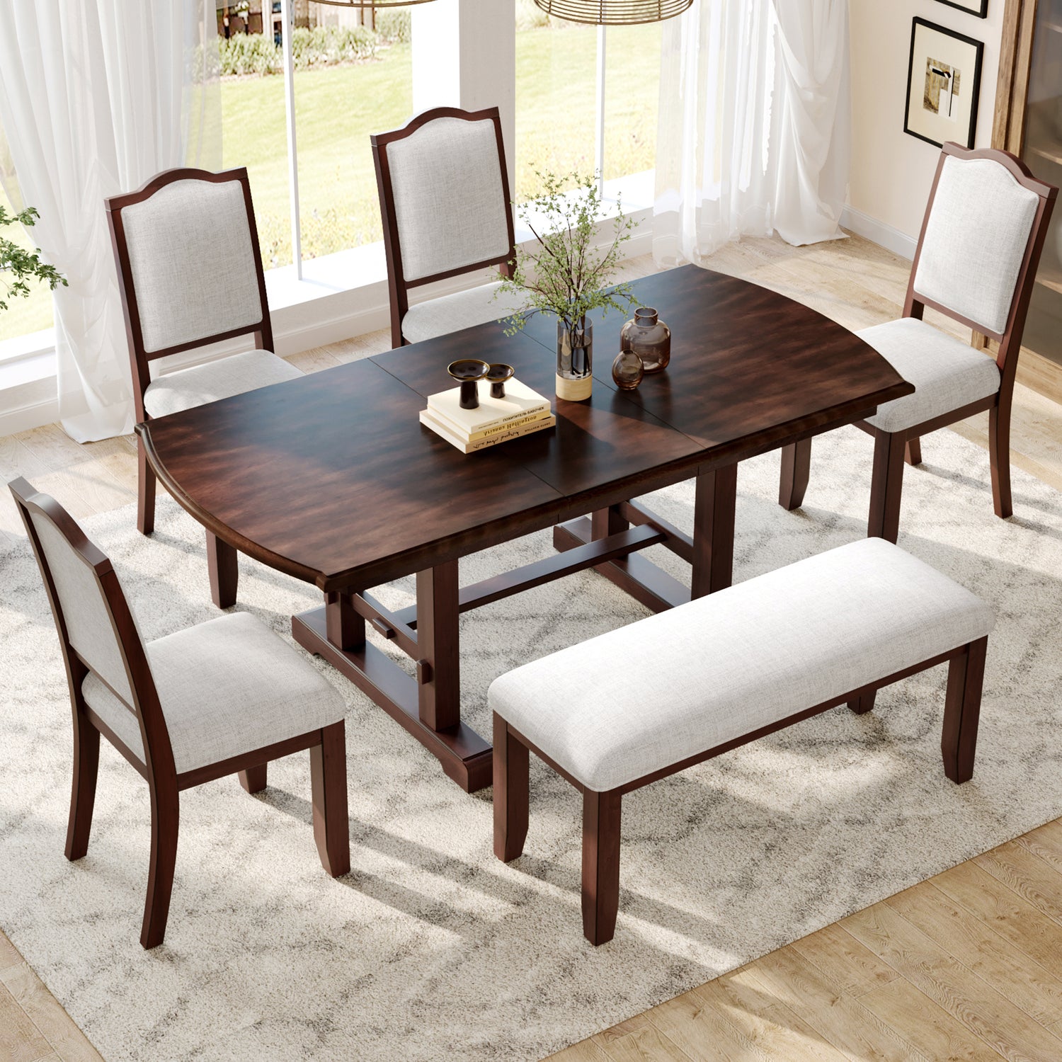 - Juego de comedor de 6 piezas: este hermoso y versátil juego de comedor de 6 piezas incluye una mesa de comedor rectangular clásica, 4 sillas tapizadas y un banco que irradia encanto clásico y agrega belleza a cualquier hogar.