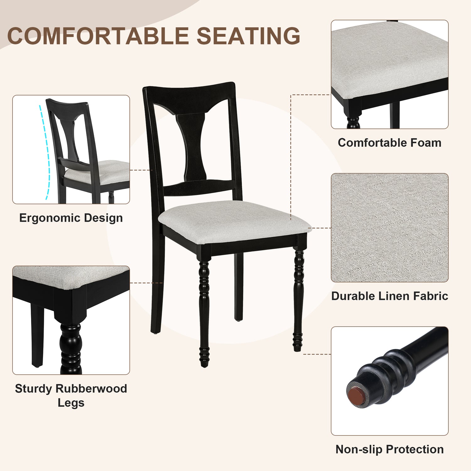 - ELEGANTES DETALLES DE DISEÑO: ¡Dile adiós a los diseños aburridos! Las patas de la mesa presentan elegantes formas cilíndricas y líneas suaves, aportando un toque de sofisticación moderna al estilo rústico. El diseño de las patas de las sillas de comedor combina a la perfección con las patas de la mesa, creando un efecto visual armonioso y unificado. Cada silla de comedor está equipada con un cómodo tapizado beige que realza la experiencia gastronómica.