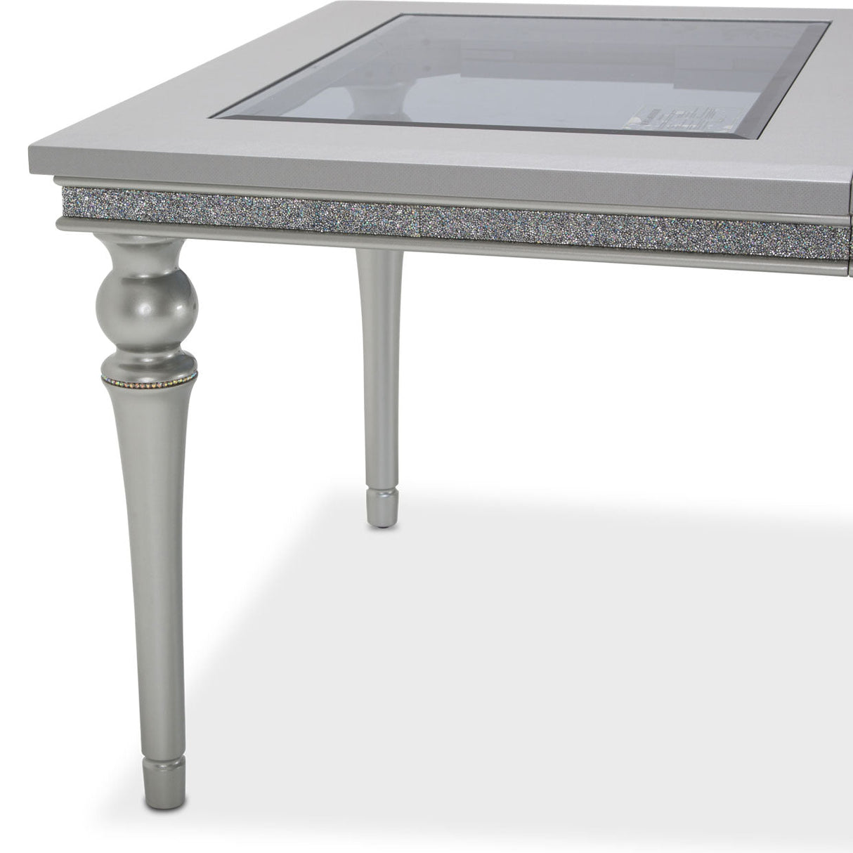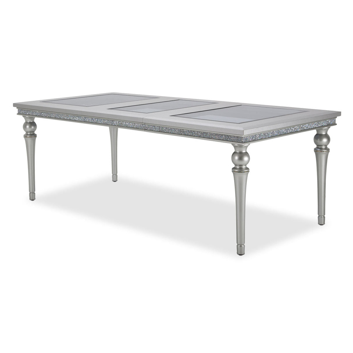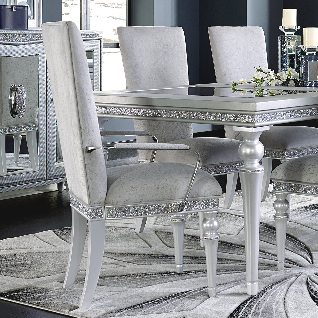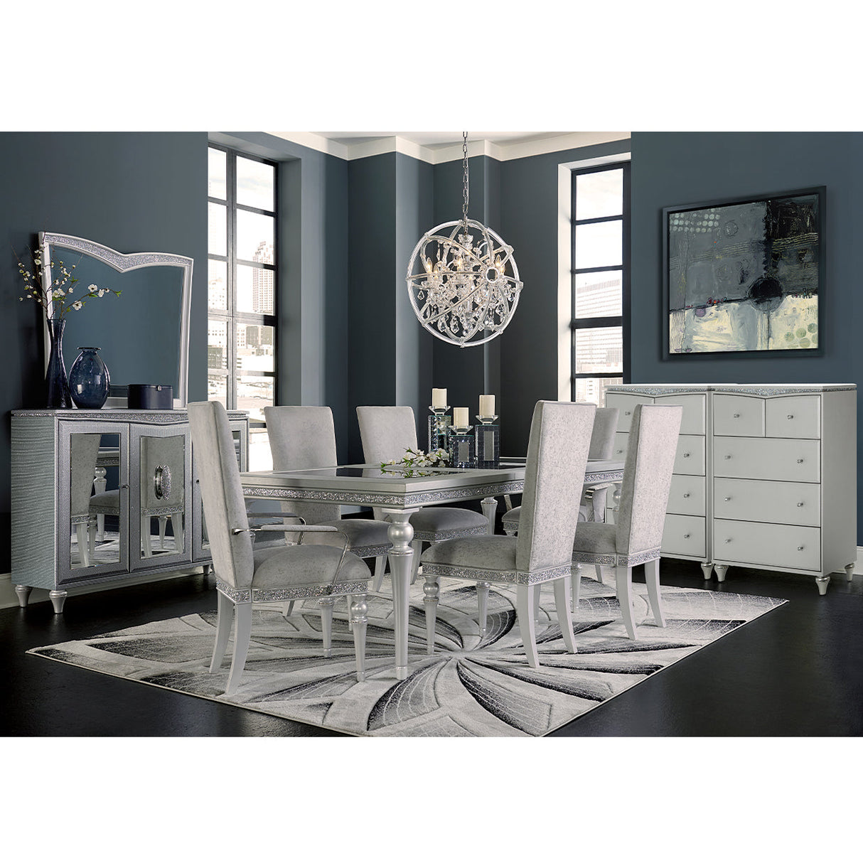 El juego de comedor rectangular Melrose Plaza de 9 piezas de AICO Furniture aporta sofisticación moderna y glamurosa a su hogar. Con un acabado en un suave tono paloma , este llamativo conjunto incluye una mesa de comedor rectangular con una tira de malla de facetas cristalizadas, patas y pies con detalles de cristal, y lujosos asientos tapizados con brazos de metal cromado moldeados, perfectos para cenas elegantes a diario y un entretenimiento espectacular.
