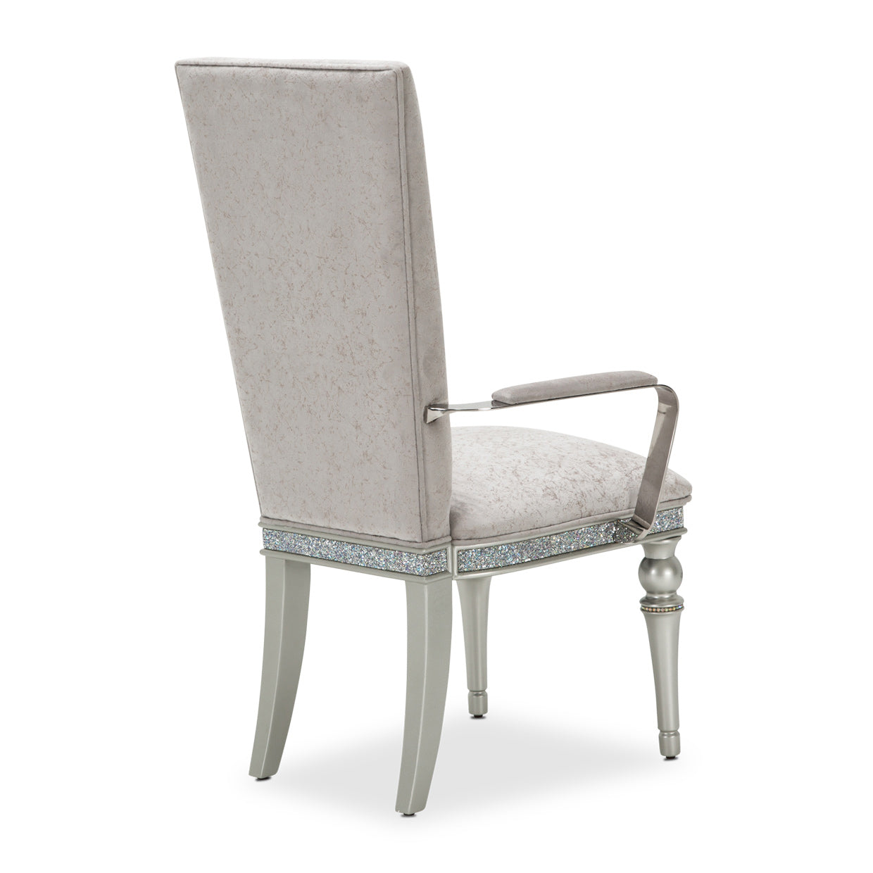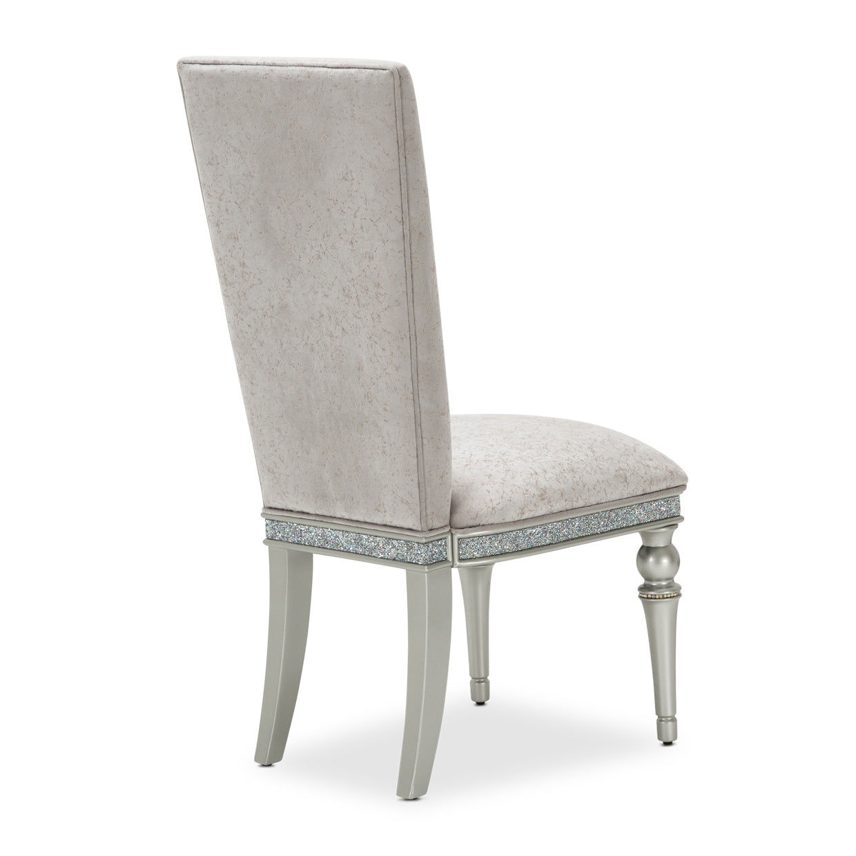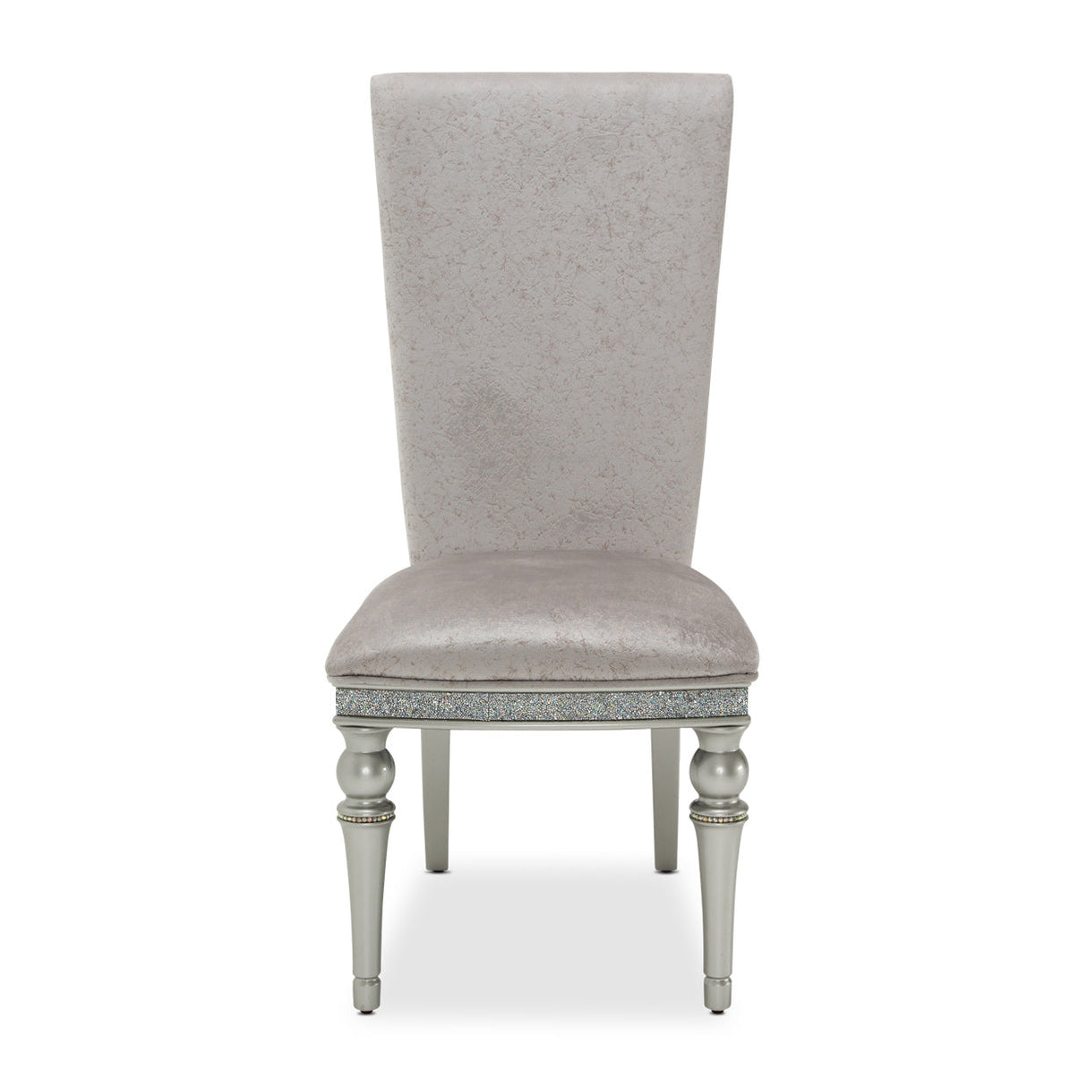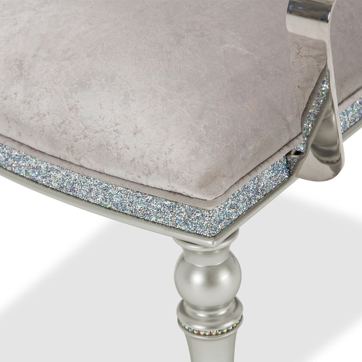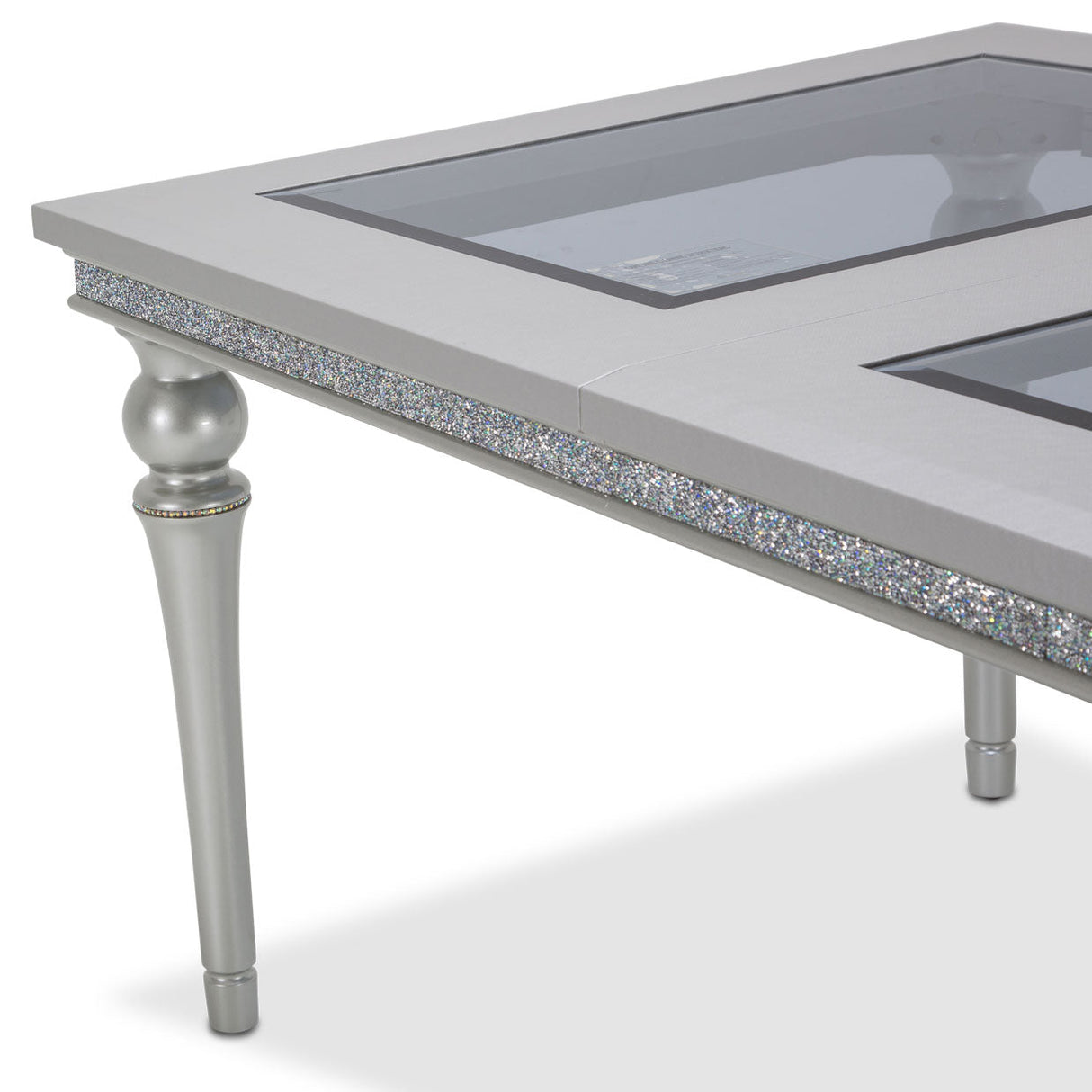 El juego de comedor rectangular Melrose Plaza de 9 piezas de AICO Furniture aporta sofisticación moderna y glamurosa a su hogar. Con un acabado en un suave tono paloma , este llamativo conjunto incluye una mesa de comedor rectangular con una tira de malla de facetas cristalizadas, patas y pies con detalles de cristal, y lujosos asientos tapizados con brazos de metal cromado moldeados, perfectos para cenas elegantes a diario y un entretenimiento espectacular.