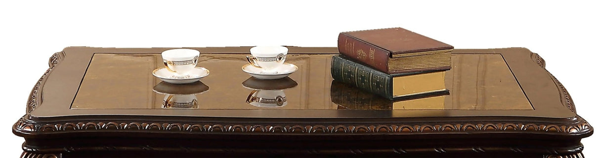 Mesa de centro Alexa de estilo tradicional en madera con acabado cerezo, 20 x 35 x 54, 169 lb. La mesa de centro Alexa de estilo tradicional de Cosmos Furniture está fabricada en madera con acabado cerezo. La mesa presenta molduras decorativas en sus patas altas cabriolé con inserciones de vidrio ahumado en el tablero. La mesa de centro Alexa es perfecta para cualquier sala de estar. La mesa auxiliar a juego se vende por separado. Otros muebles de sala a juego se venden por separado. - Mesa de centro de estilo tradicional - En madera con acabado cerezo - Tablero de mármol - Patas cabriolé - Detalles de volutas doradas cepilladas - Tallado detallado en el borde - Patas decorativas - Patas decorativas - Las piezas a juego se venden por separado - Requiere ensamblaje - -