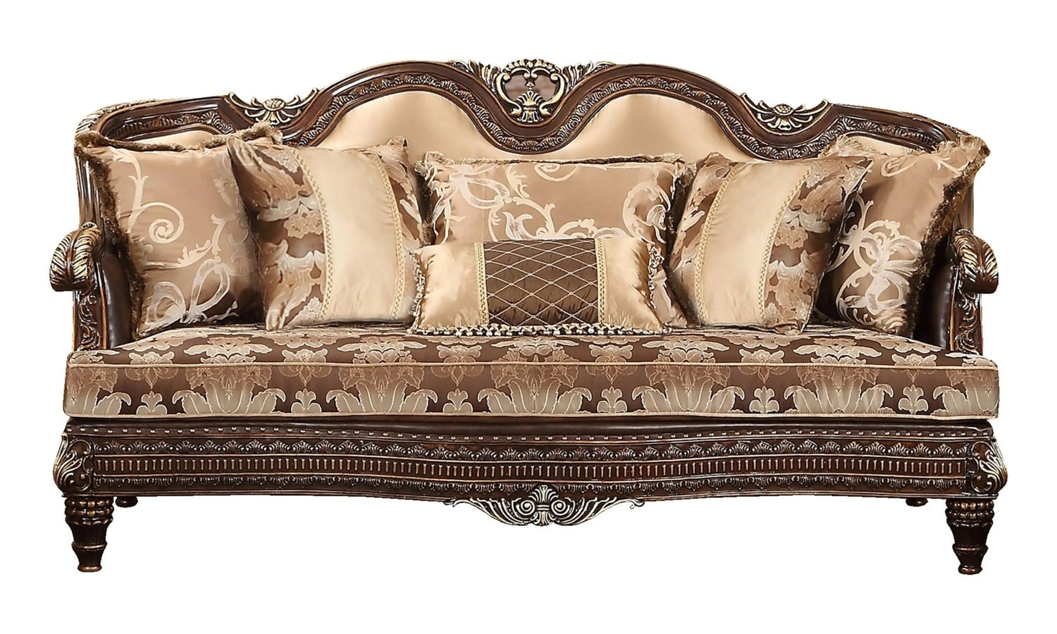 Dale un toque de elegancia atemporal a tu hogar con el sofá Alexa de estilo tradicional en un cálido acabado cerezo de Cosmos Furniture . Diseñado con molduras intrincadas y tapizado en una lujosa combinación de piel sintética y chenilla, este sofá es la pieza central perfecta para interiores de salas de estar clásicas.