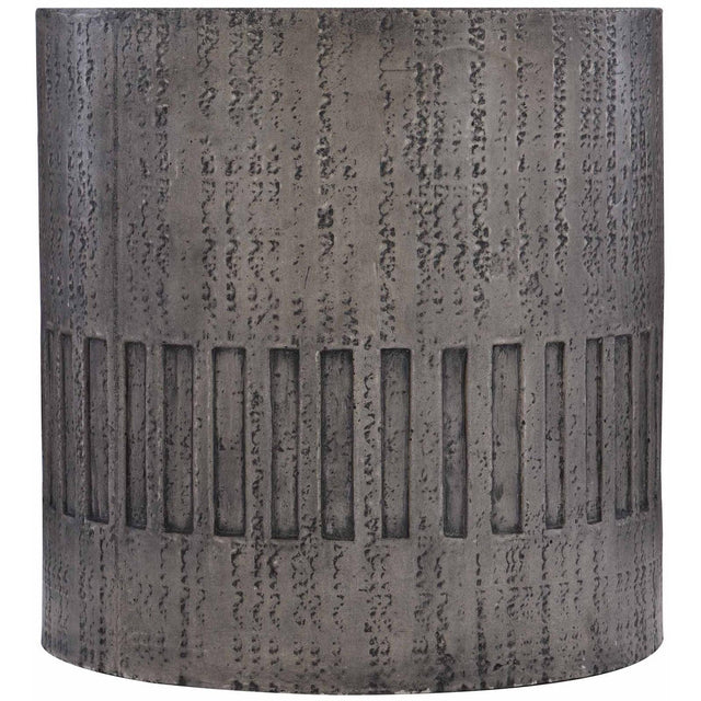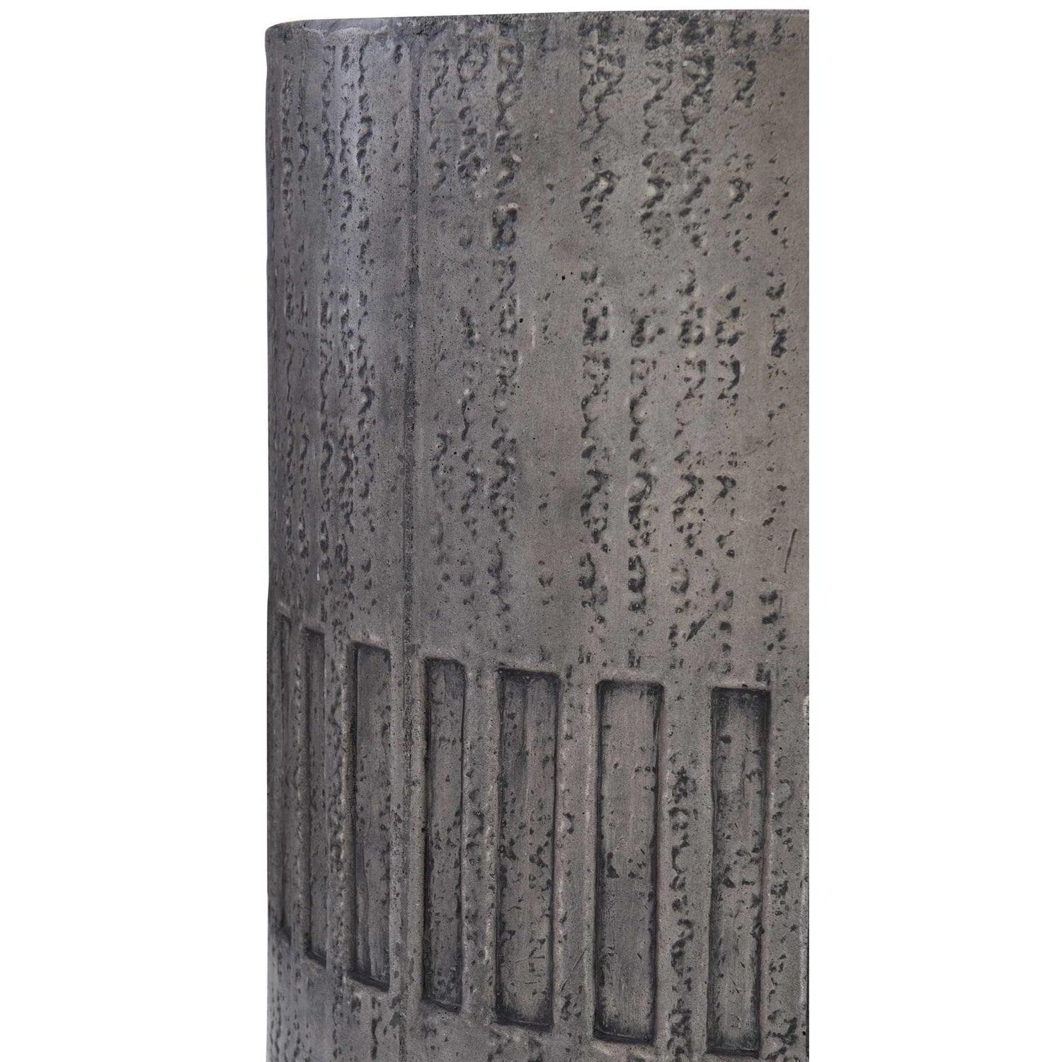 - Realizado en hormigón texturizado con un acabado color carbón oscuro, presenta irregularidades rústicas y un patrón geométrico grabado.