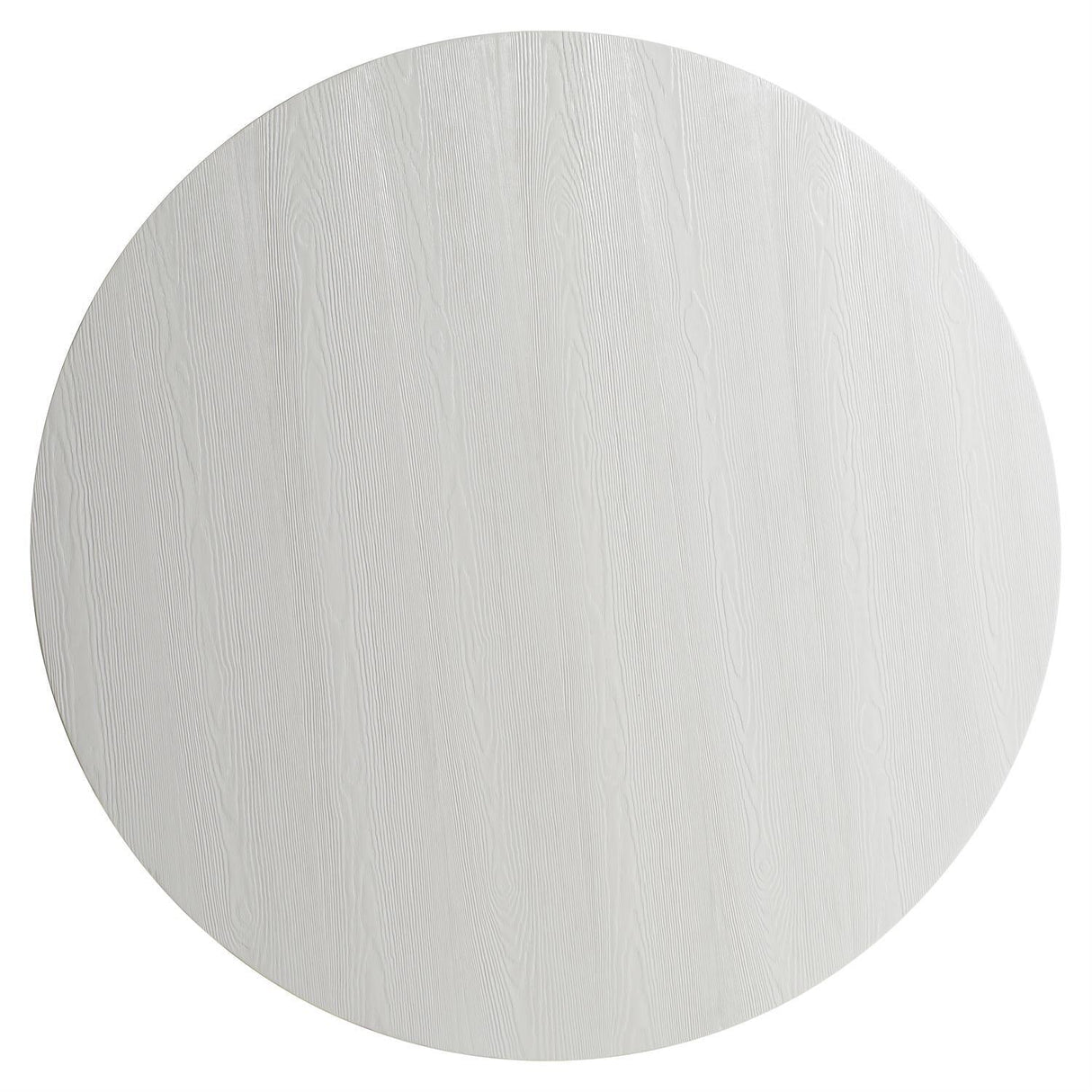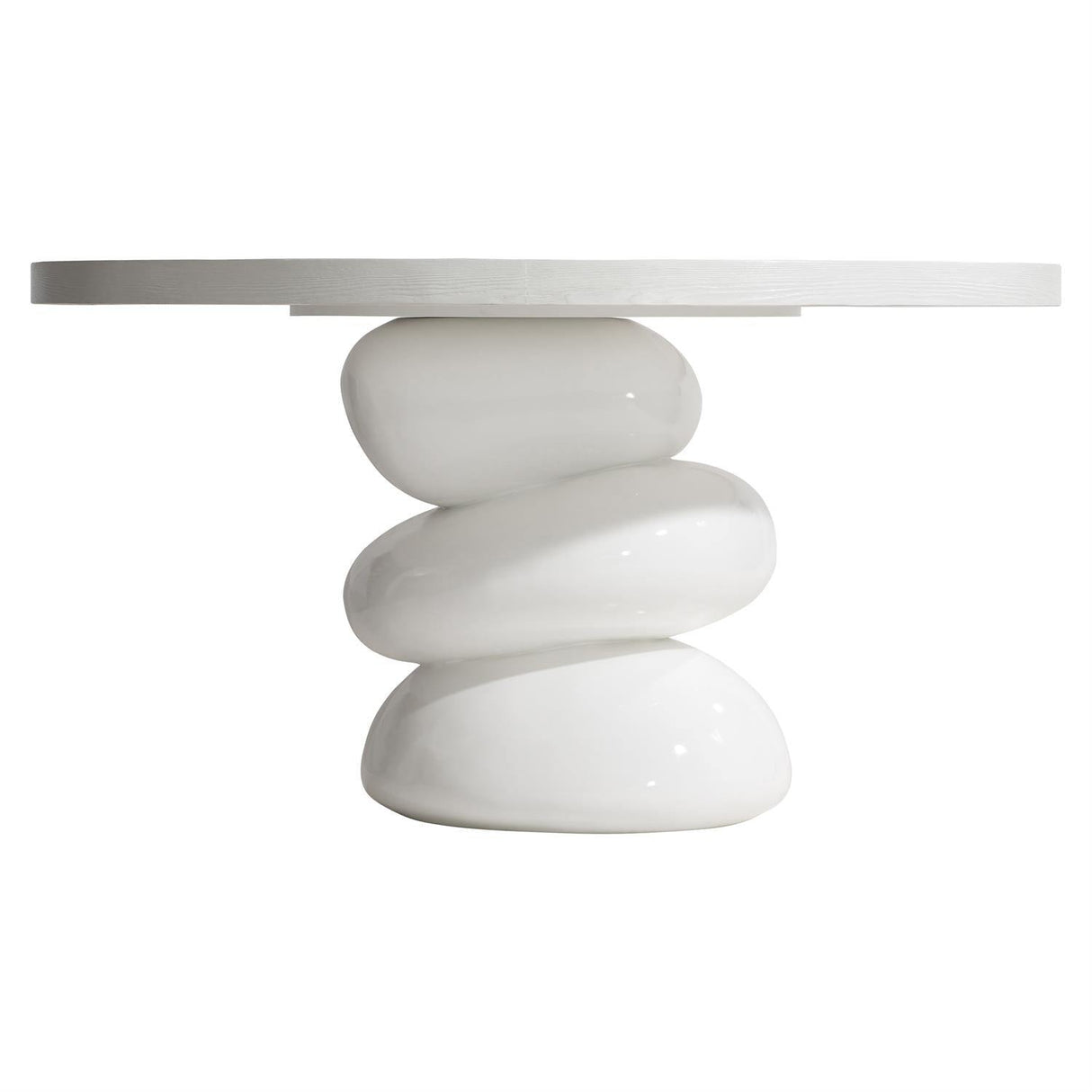 La mesa de comedor redonda Navar de Bernhardt Furniture presenta un tablero chapado en pino con acabado Azúcar, sostenido por una base de pedestal escultural con tres formas apiladas de piedra artificial en resina brillante. Parte de la colección Bernhardt Interiors, esta mesa de inspiración orgánica equilibra texturas naturales con un diseño artístico, convirtiéndola en un elegante punto focal para comedores.