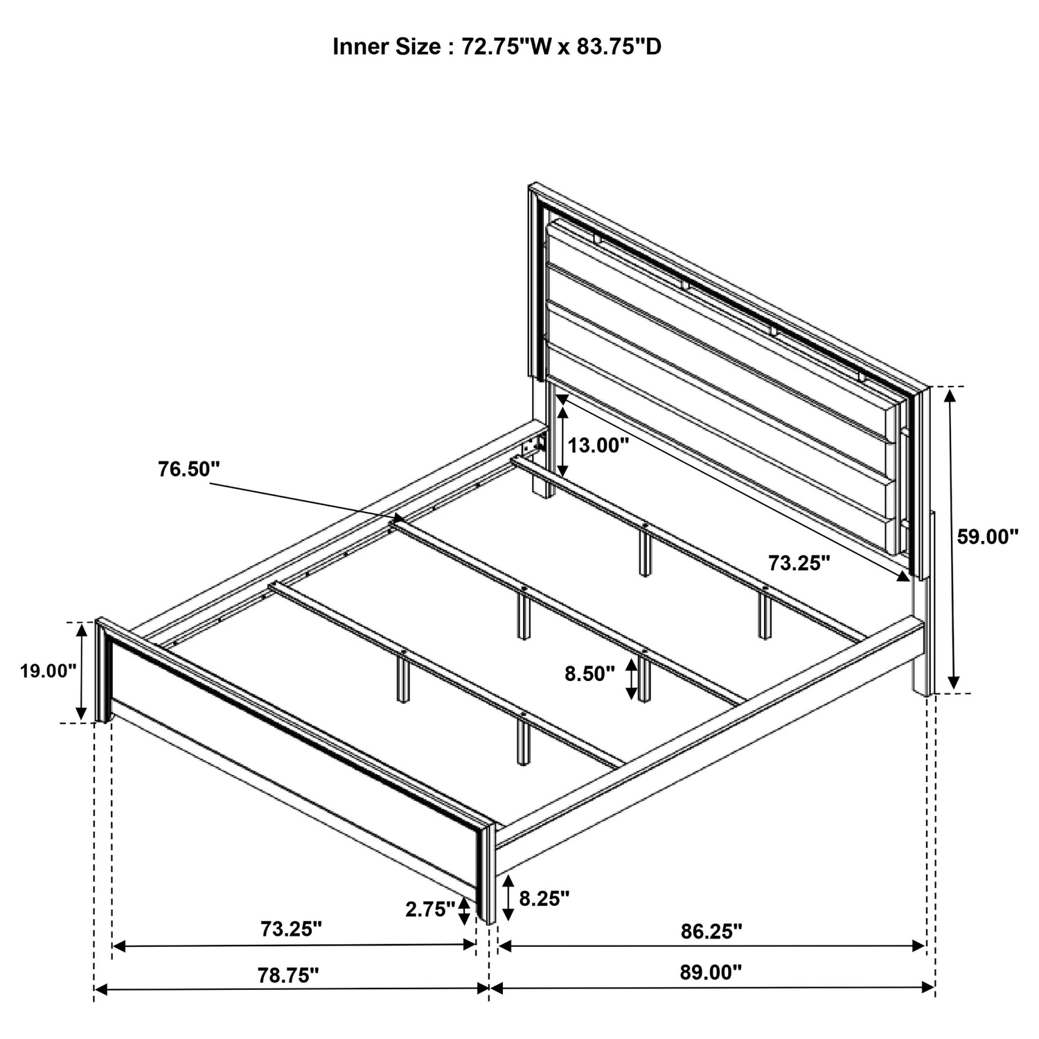 Cama California King: 78,75" de ancho x 89,25" de profundidad x 59,25" de alto