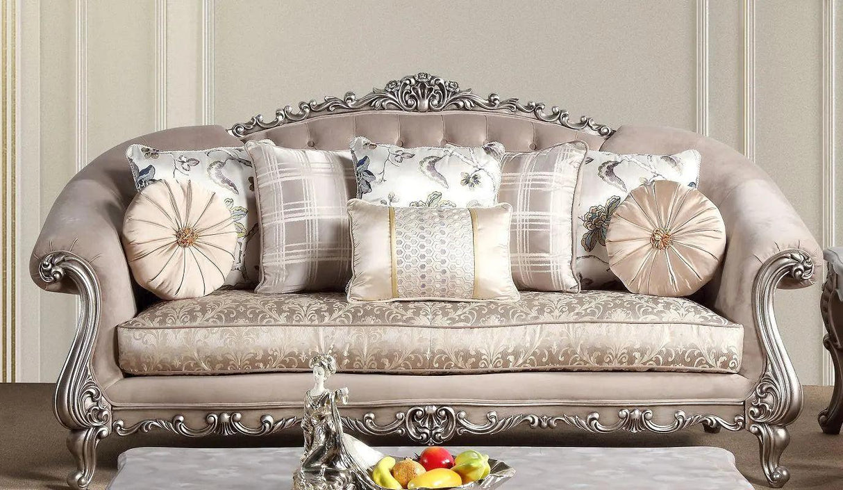 El juego de sofá Cristina de Cosmos Furniture, de estilo tradicional beige y con acabado plateado, ofrece un estilo lujoso y un confort inigualable, con cojines de asiento con muelles embolsados. Cristina destaca por su diseño y tacto, con un respaldo alto y envolvente con un gran detalle tallado. La atención al detalle en la madera maciza, con detalles ornamentales y perforados, rodea un respaldo firme y cojines de respaldo sueltos, compuestos por 5 cojines decorativos, un cojín renal y 2 cojines redondos. Los brazos están elegantemente enrollados y presentan brazos frontales de elegante forma, montados sobre patas cabriolé hábilmente talladas y sujetados por un faldón a juego. La tela afelpada se adapta a las formas de los detalles de madera y está rematada con un ribete de tachuelas. Se incluyen cojines decorativos. Las piezas a juego se venden por separado.