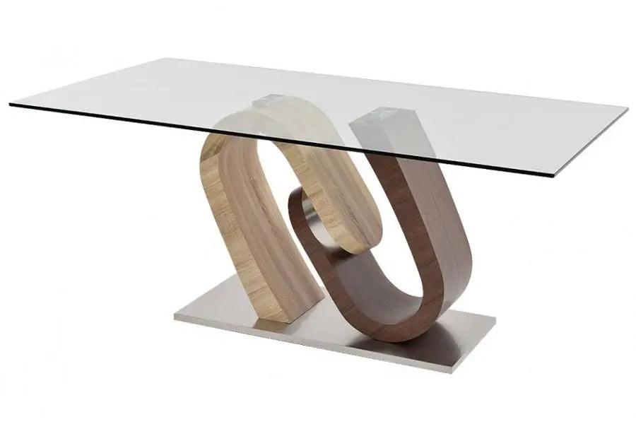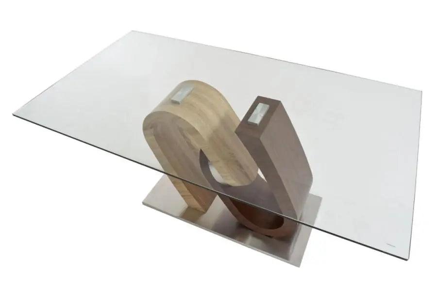 Luce un estilo único en tu cena con la contemporánea colección de comedor Serie D4126. Este acogedor juego de comedor cuenta con una mesa central con tablero de cristal transparente, rodeada de sillas únicas y cómodas, además de un amplio aparador. El pedestal central de la mesa rectangular presenta acabados dobles de roble y nogal en un patrón curvo abstracto, con base de acero inoxidable cepillado para una apariencia elegante y moderna.