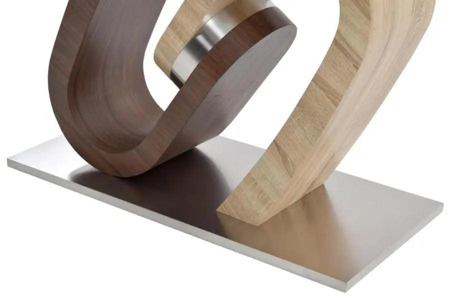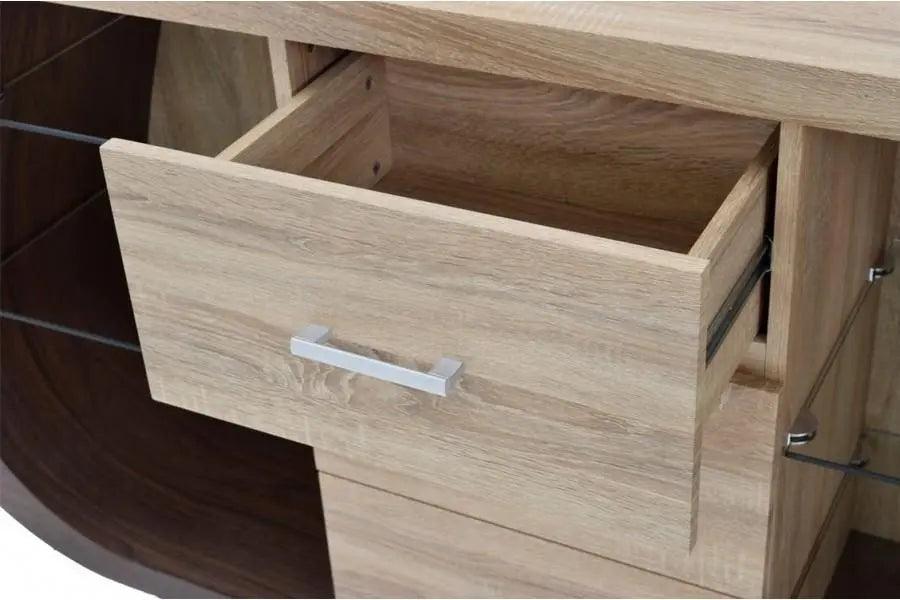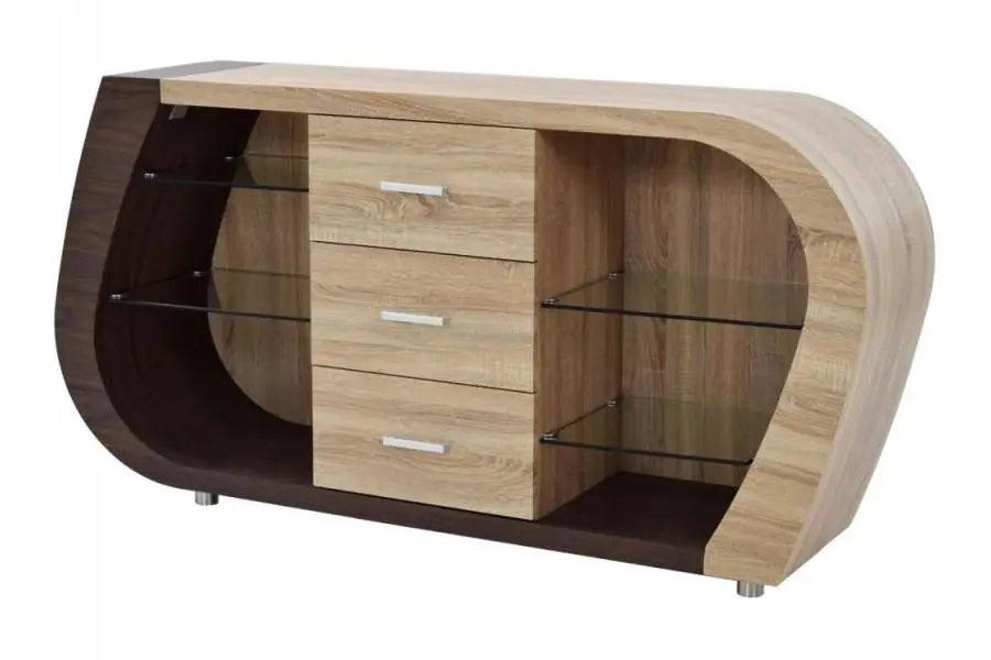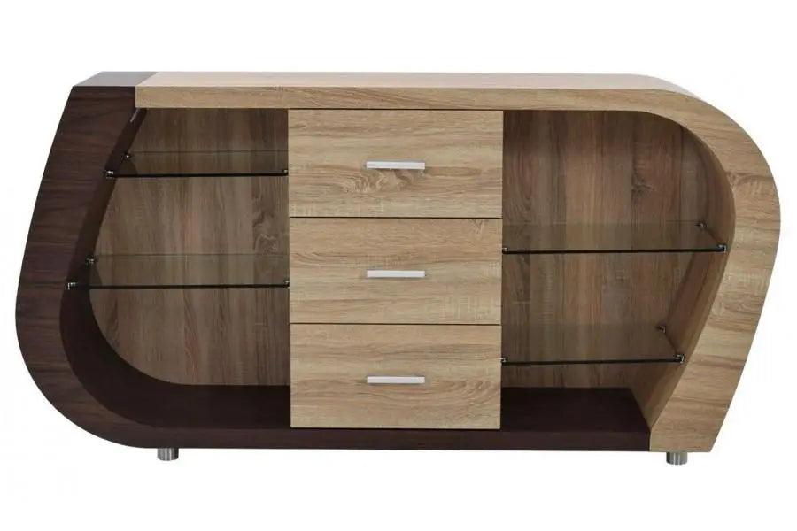 Su estructura curva con doble acabado en roble y nogal, así como sus estantes de cristal abiertos, hacen de este aparador un complemento imprescindible para su comedor contemporáneo. Los cajones de almacenamiento amplían su funcionalidad. Añada un toque lujoso y contemporáneo a la decoración de su comedor con la impresionante colección de comedores Serie D4126.